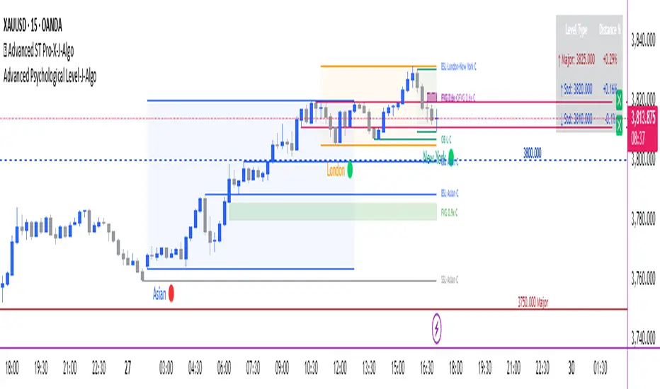 This indicator combines multiple ICT-based market structure concepts into a single, configurable tool. It provides visual identification of liquidity zones, order blocks, fair value gaps, and trading session boundaries. The indicator includes advanced anti-repainting controls to ensure historical accuracy.