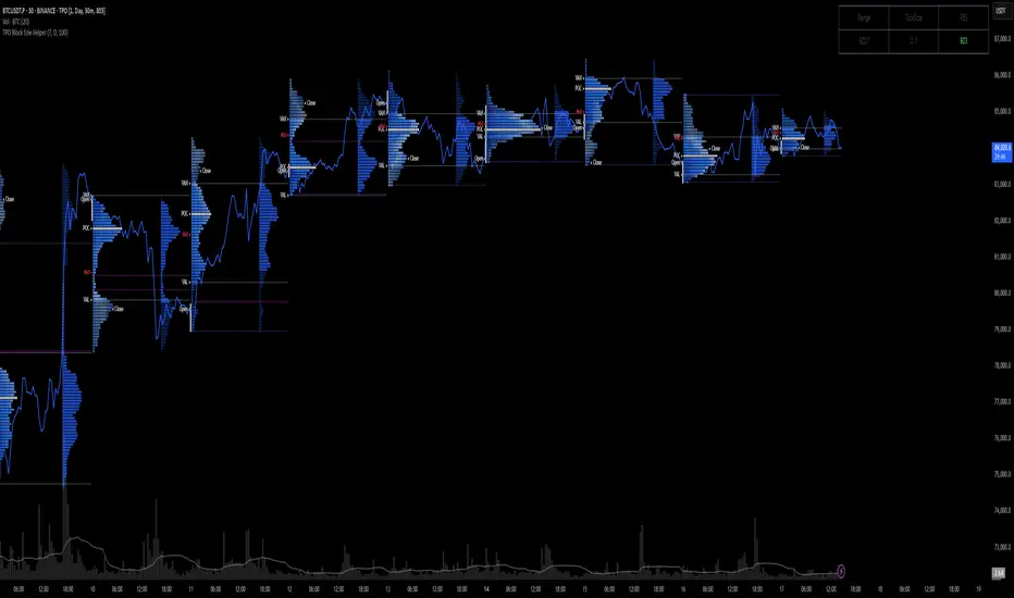 By statistically analyzing the volatility of the past N days, the assistant calculates a recommended block size for the current ticker. This value can be manually entered into the official TPO indicator on TradingView, helping users align the chart resolution with the underlying market’s price behavior.