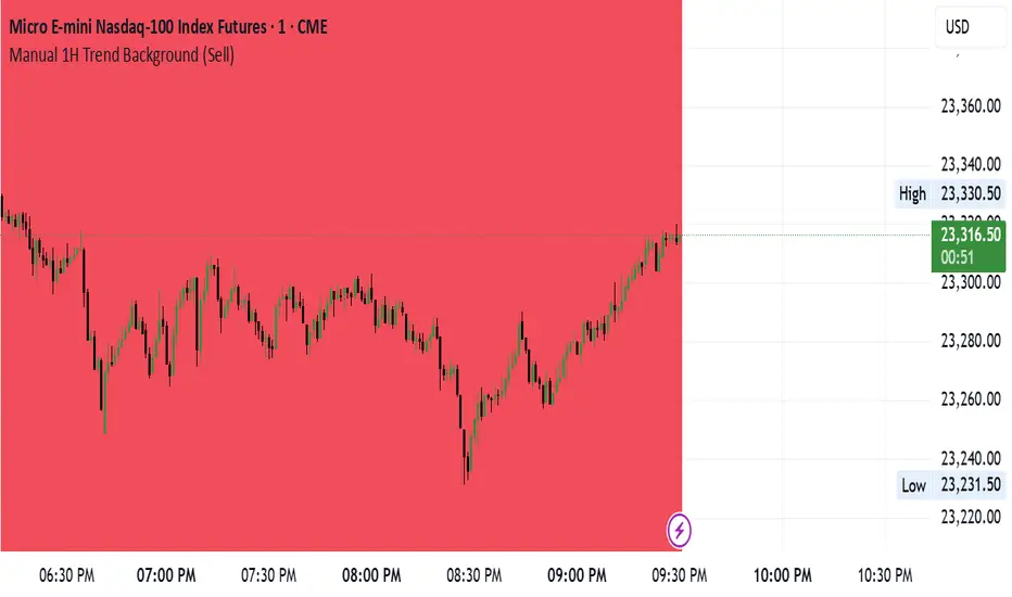 This TradingView Pine Script v6 indicator allows you to manually set the trend direction (based on your analysis of the 1-hour timeframe), and it will change the background color of your chart based on that input: