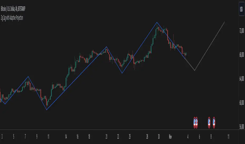 The "Zig Zag with Adaptive Projection" is an advanced technical analysis tool designed for TradingView's Pine Script platform. This indicator builds upon the traditional ZigZag concept by incorporating adaptive projection capabilities, offering traders a more sophisticated approach to identifying significant price movements and forecasting potential future price levels.