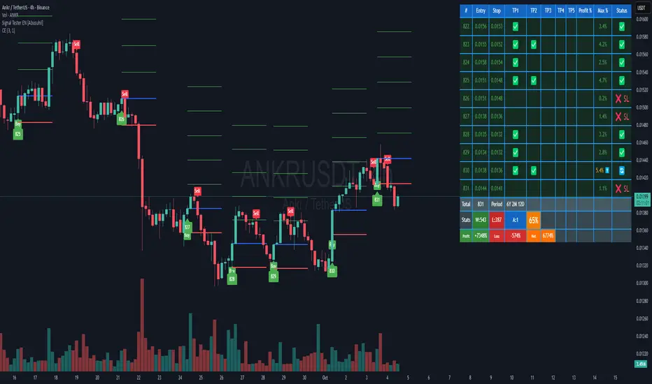 Signal Tester is a comprehensive trading tool designed to backtest and analyze external trading signals with advanced risk management capabilities. The indicator provides seven different calculation methods for stop-loss and take-profit levels, along with detailed performance statistics and real-time tracking of active trades.