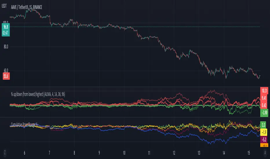 Percentage difference at current price (close) to lowest and highest certain number of bars ago (14, 36, 96).