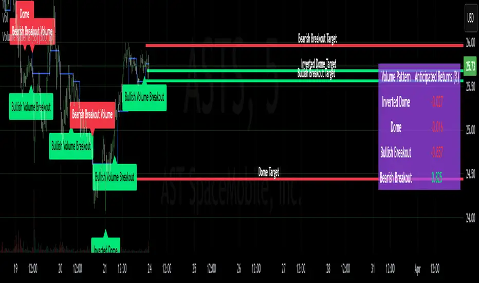 These patterns are all assigned to a classification based on theory. For example, dome volume is usually bearish, inverted dome is usually bullish, etc. etc. However, in order to accommodate changing sentiments and volatility, I have coded logic into the indicator to assess for the actual sentiment associated with these patterns itself.