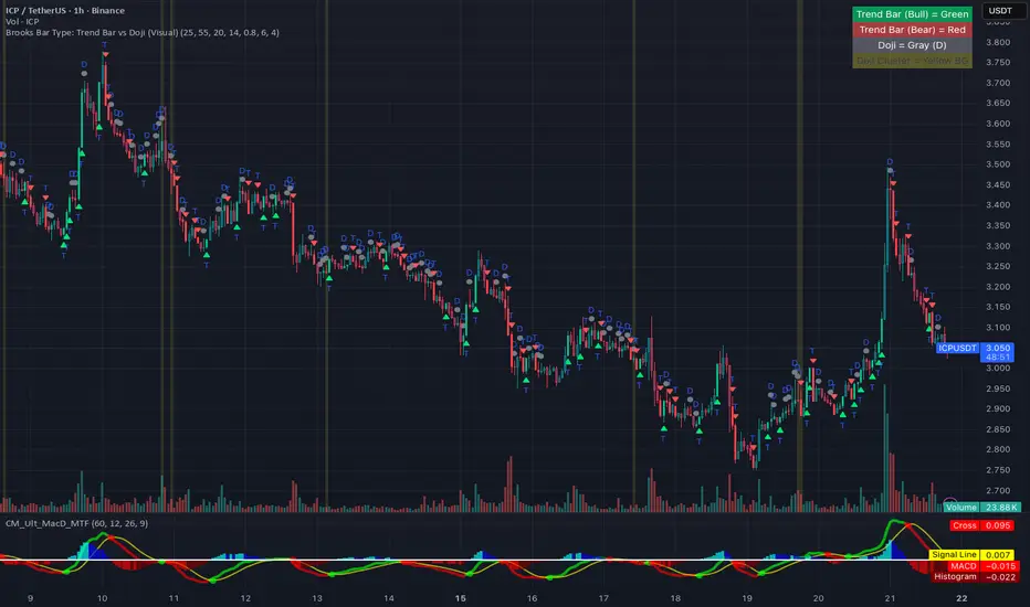 This indicator visually classifies every candlestick into Trend Bars and Doji Bars, inspired by classic bar-by-bar price action reading.