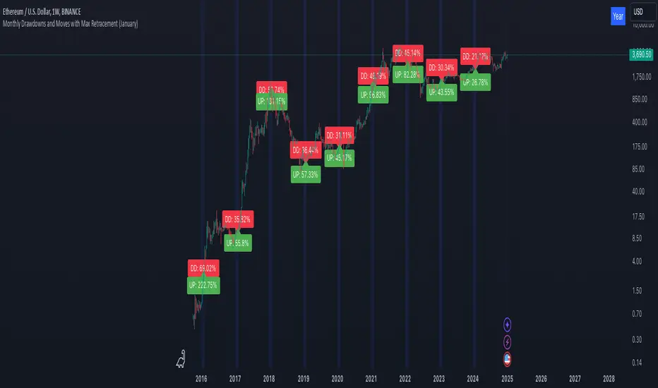 This script allows users to analyze the performance of a specific month across multiple years, focusing on maximum drawdowns and maximum upward moves within the selected month. The script offers the following features: