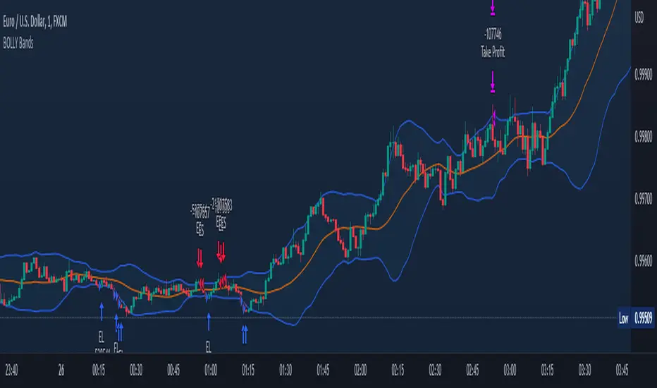 This is a strategy using Bollinger Bands. The strategy is predicated around having low volatility in price action and then looking to capture a move when price starts to trend outside of the Bollinger bands. This strategy has only been backtested for 1 month but it has promising results so I will be sharing it looking for feedback. I run this strategy on the ERUSD 1 min chart.