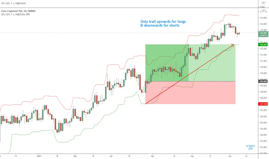 For long trades, the stop loss price is calculated by subtracting the current ATR value from the lowest-low of the given lookback period.