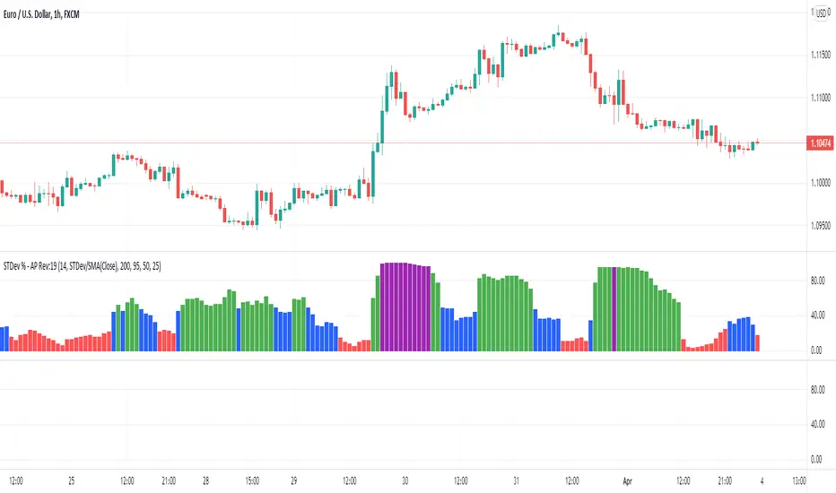 This indicator displays the volatility as standard deviation as a % of asset value, this allows using more standardized and comparable values across multiple instruments and asset classes.