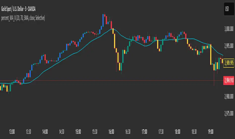 Use "Selective" mode to color bars blue when they exceed the percentage above the MA (bullish) or yellow when they exceed it below (bearish)Use "All" mode to color all bars above the MA green and all below red