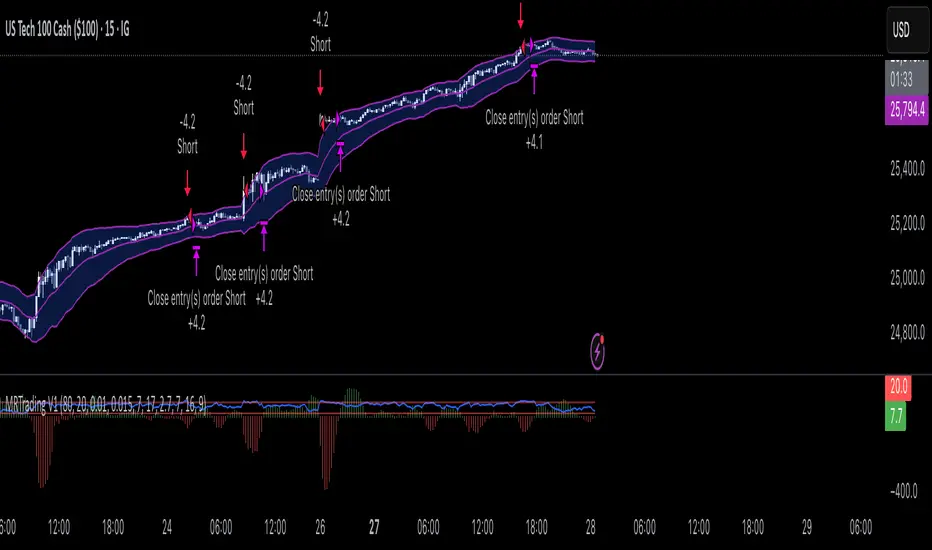 This is a simple mean reversion strategy that combines RSI, Keltner Channels, and MACD Histograms to predict reversals. Current parameters were optimized for NASDAQ 15M and performance varies depending on asset. The strategy can be optimized for specific asset and timeframe.