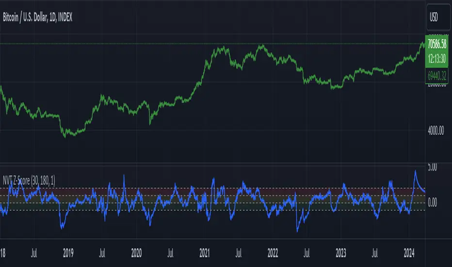 Z-Score Analysis: The script calculates the mean and standard deviation of the NVT ratio over a user-defined period (daysForMean, defaulting to 180 days) and then computes the Z-score of the current NVT ratio relative to this historical data. This Z-score analysis introduces a standardized way of understanding the NVT ratio's deviation from its historical average, offering a nuanced view of market valuation states.
