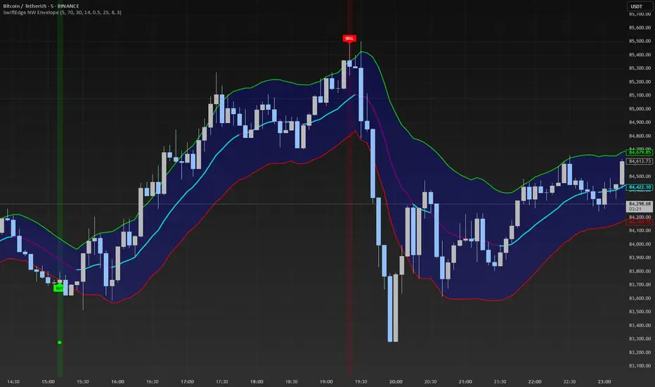 The SwiftEdge NW Envelope generates buy and sell signals based on price interactions with dynamically calculated support and resistance bands, confirmed by RSI conditions. The indicator: