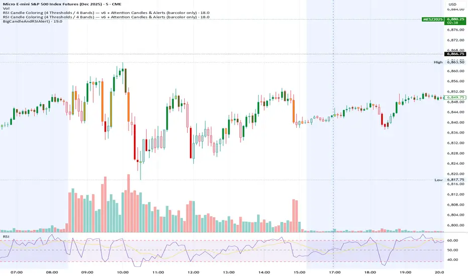 Changes Candle Color to your choosing for Big Candles or Big Wick Candles or Over Bought/Oversold RSI Levels.