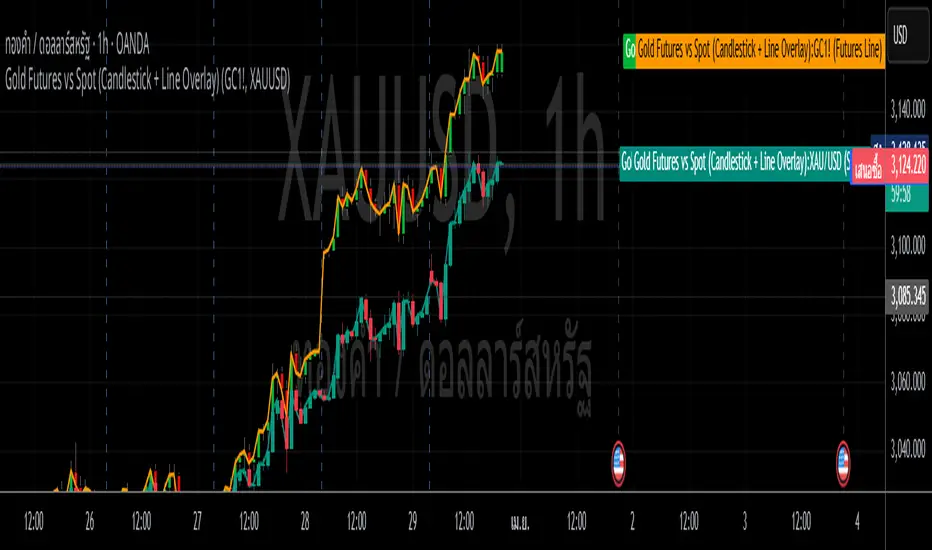 Gold Futures vs Spot (Candlestick + Line Overlay)