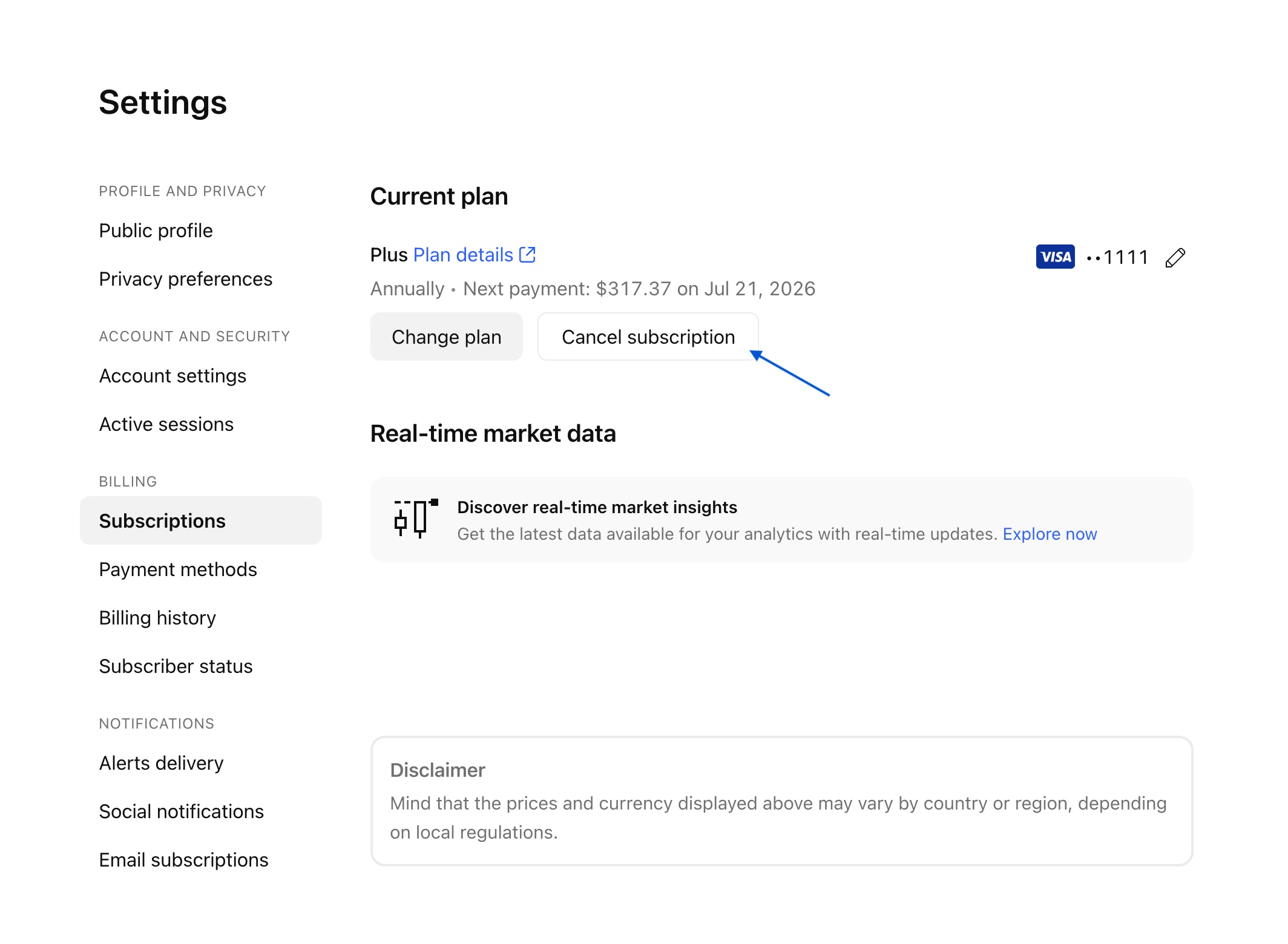 我想取消自动续订在网站购买的订阅在订阅自动续订之前,您可以随时关闭自动续订。为此,请转到您的设置和账单 –> 订阅 –> 取消订阅。 重要提示:取消后,您可以使用订阅,直到付费期结束,之后订阅将停止,不会自动续订。为避免下一个账单日期被收费,请在下一个账单日期前至少24小时取消。之前之前当我使用推荐收益购买订阅时,为什么必须提供账单信息?接下来接下来我想取消通过移动app购买的订阅的自动续订开启超级图表