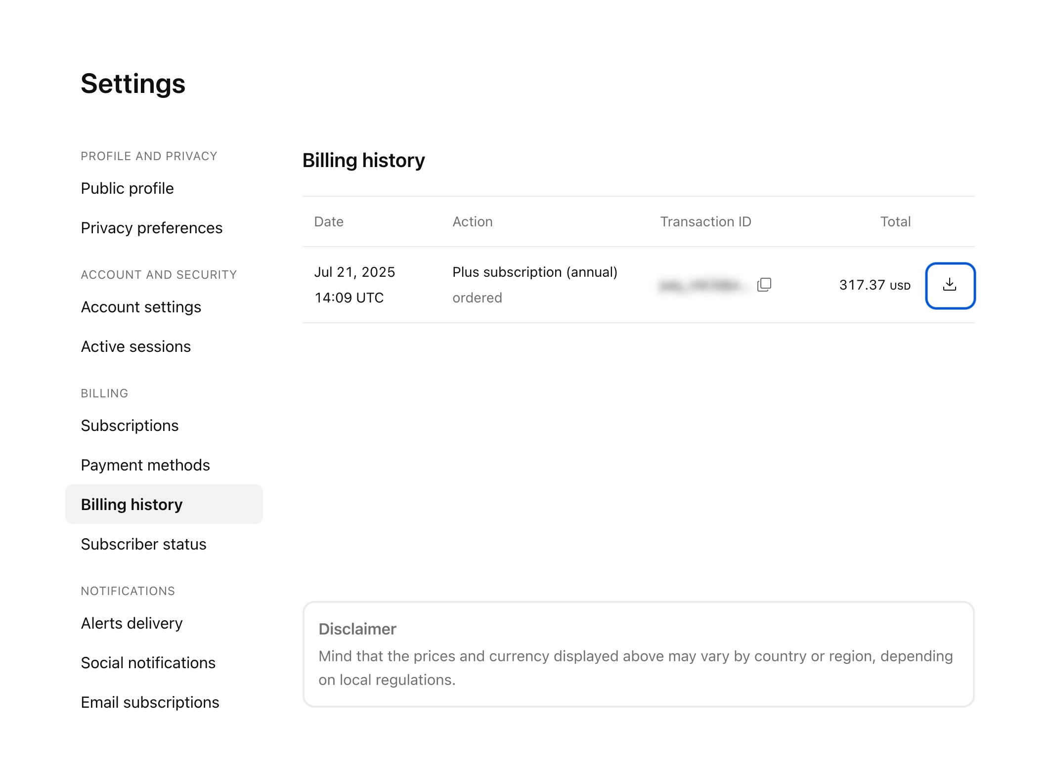 您可以从个人资料设置的“账单历史”标签页下载您的发票。只需找到您的订阅并点击“获取发票”图标即可;