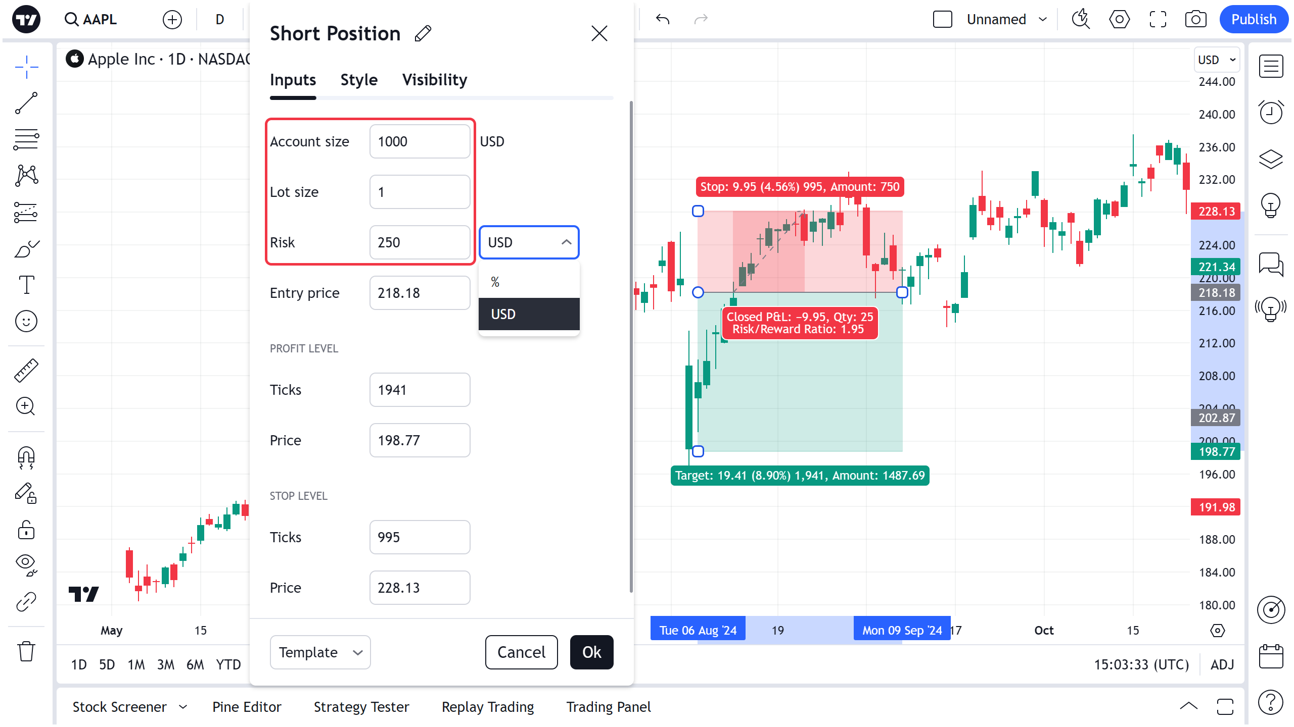 2. 在该工具的属性对话框中,以默认或选定的货币输入您的初始账户大小和风险金额(绝对数字或账户大小的百分比)。您还可以输入交易手数和设置杠杆比例。然后点击确认(OK)以确定。