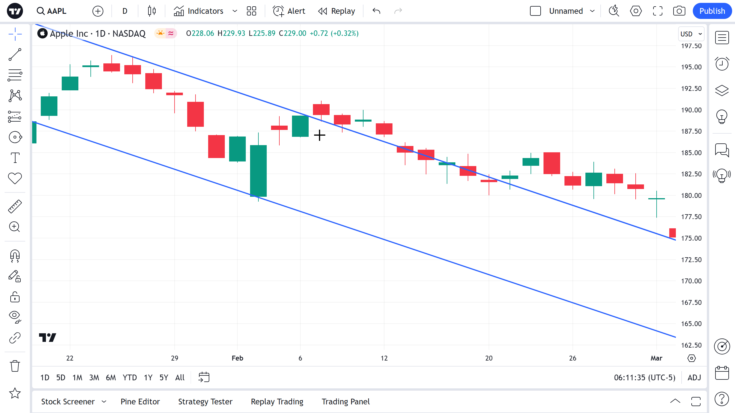 例如,我们通过趋势线绘图工具将2条平行线添加到图表中,图表周期1天: