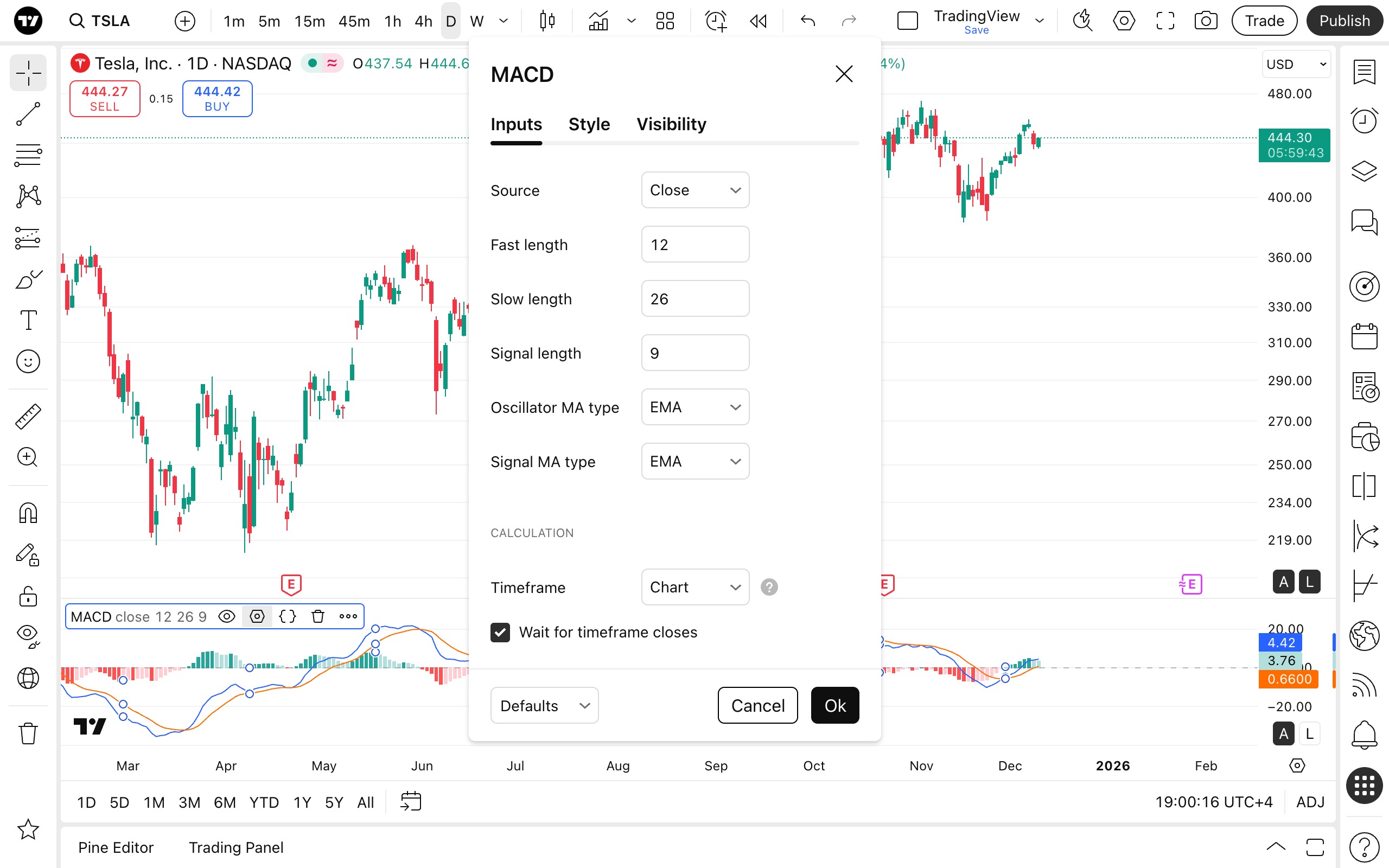- 信号线移动平均线类型:指定指标应用于MACD以计算信号线的移动平均线类型。选择“EMA”使用指数移动平均线,或选择“SMA”使用简单移动平均线。