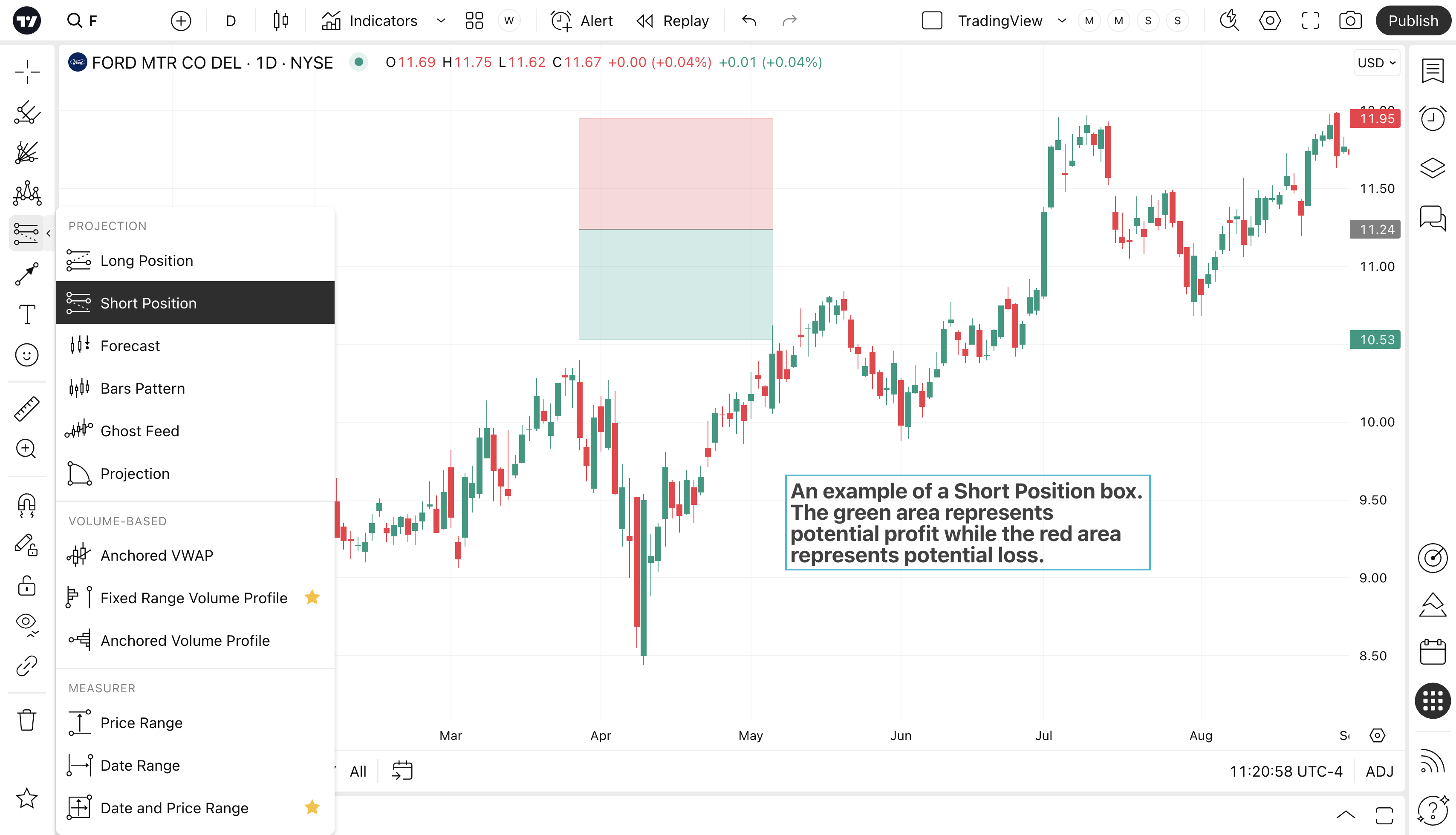 空头仓位工具允许用户设置入场点并从该点开始做空仓位。 在该价格水平之上和之下延伸将是两个盒子; 绿色为盈利区,红色为亏损区。 用户可以手动调整这两个区域以改变风险/回报率。