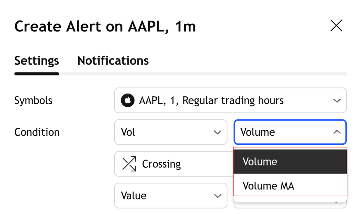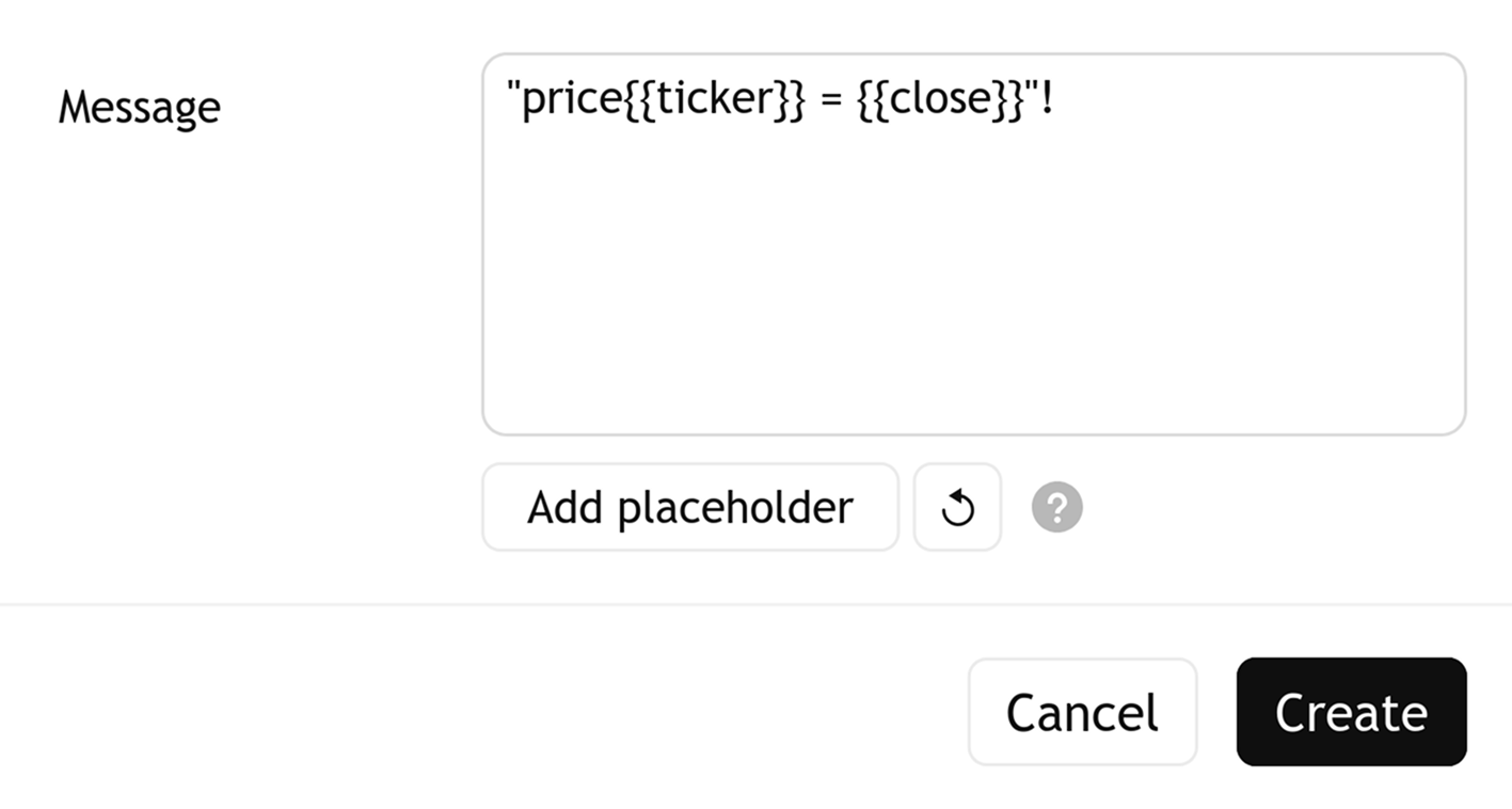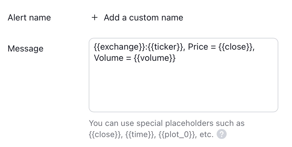 您可以使用特定的占位符来存取警报里的变数值。例如,您可以在 NASDAQ:AAPL 建立警报并在消息 (Message) 框里输入: