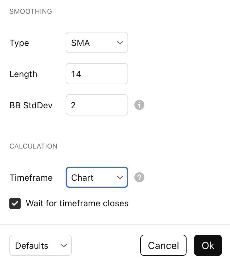 我们许多内置指标都具备多时间周期(MTF)功能。如果具备此功能,脚本的“设置/输入”标签页中会包含“计算”部分,其中包含一个“时间周期”下拉菜单,您可以在其中选择要计算该指标的时间周期。例如,这样您就可以在查看1小时图表的同时查看日移动平均线。