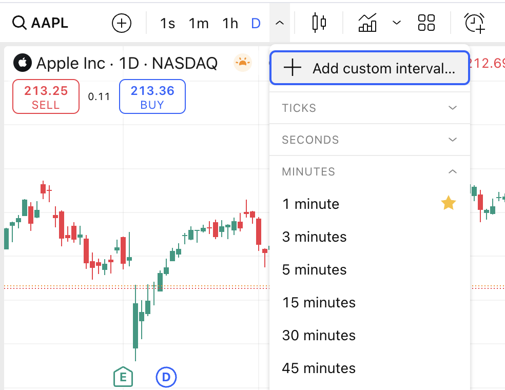 如果您想在“时间周期”下拉菜单中添加新的时间周期,可以通过在图表页面上的“时间周期”主下拉菜单中添加来实现。两个菜单共享自定义时间周期列表。
