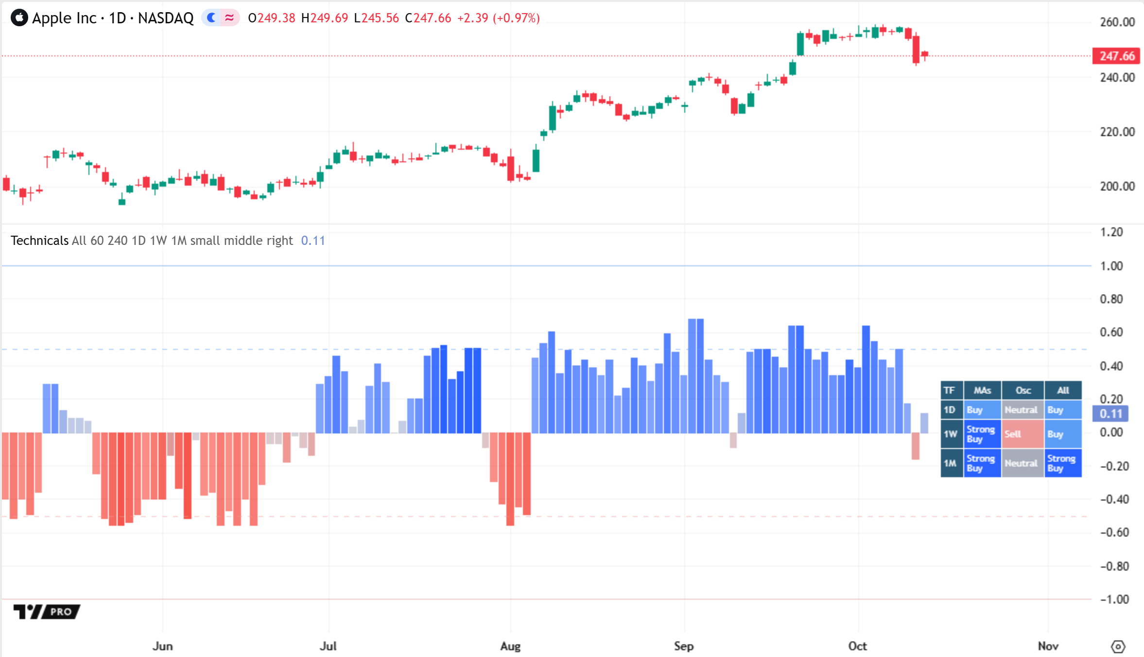 每个组成指标对每个选定时间周期的平均评级贡献一个值,分别为 -1(“卖出”)、0(“中性”)或 +1(“买入”)。最终的平均值在 -1 和 +1 之间波动,其中: