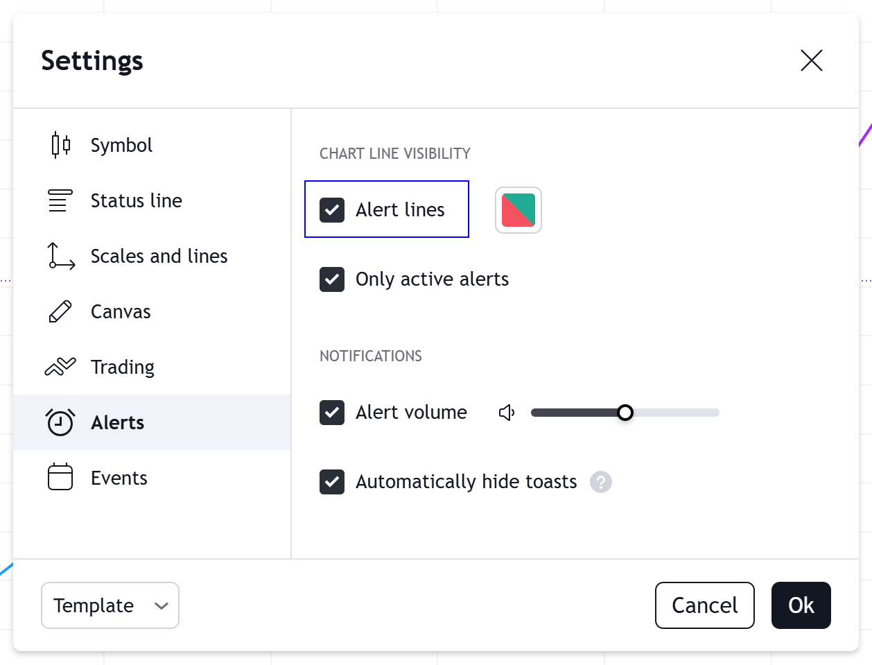 如何启用/禁用图表上的警报线您可以通过右键单击线条本身或坐标上的警报标签,然后在下拉菜单中选择“警报线”来启用或禁用警报线。 此设置也可在“警报”标签页上的图表设置中使用。之前之前如何在价格坐标上启用加号按钮接下来接下来如何折叠单独的窗格?开启超级图表