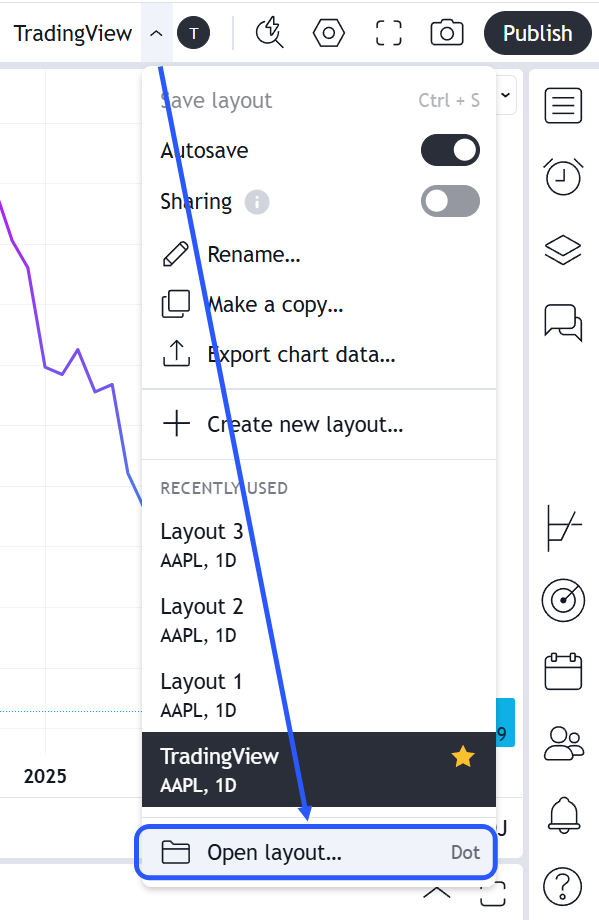 布局和图表不会与自选表相关联。通常,自选表可以被视为帐户范围内的单独插件,不属于特定图表或布局。这意味着您可以切换到不同的布局 — 这基本上是图表和交易分析的不同工作区(更多内容见下文) — 但自选表将保持不变,您会在右侧工具栏上看到相同的自选表。