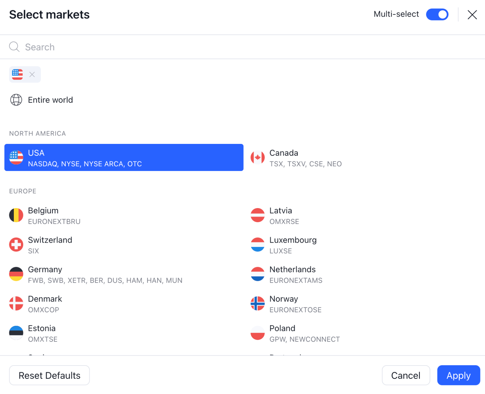 !注意:在转换市场时,请务必了解货币兑换原则。 借助“全球筛选器”功能,您可以访问全球股票视图模式,在该模式下,您可以筛选50多个国家/地区的70多个市场。