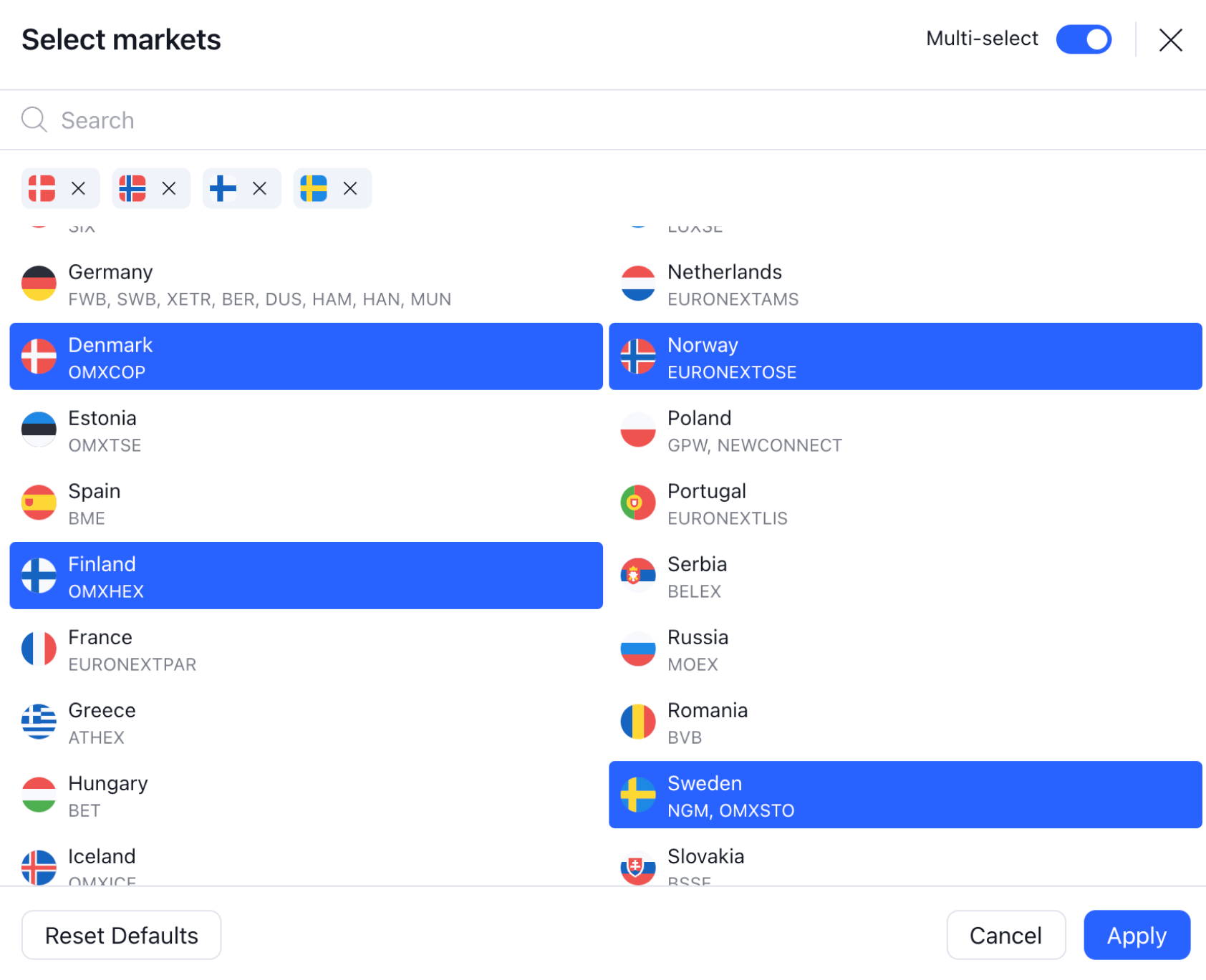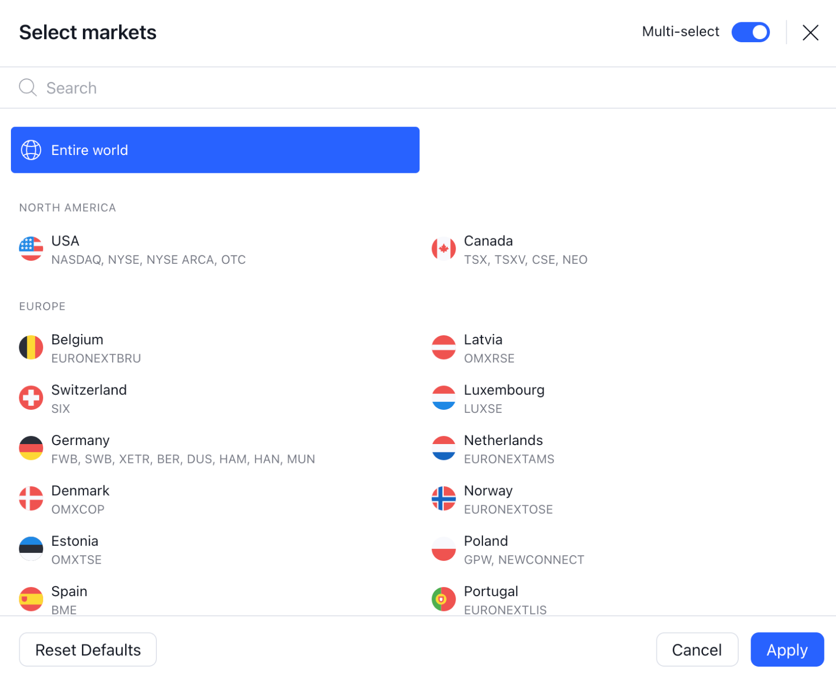 借助“全球筛选器”功能,您可以访问全球股票视图模式,在该模式下,您可以筛选50多个国家/地区的70多个市场。