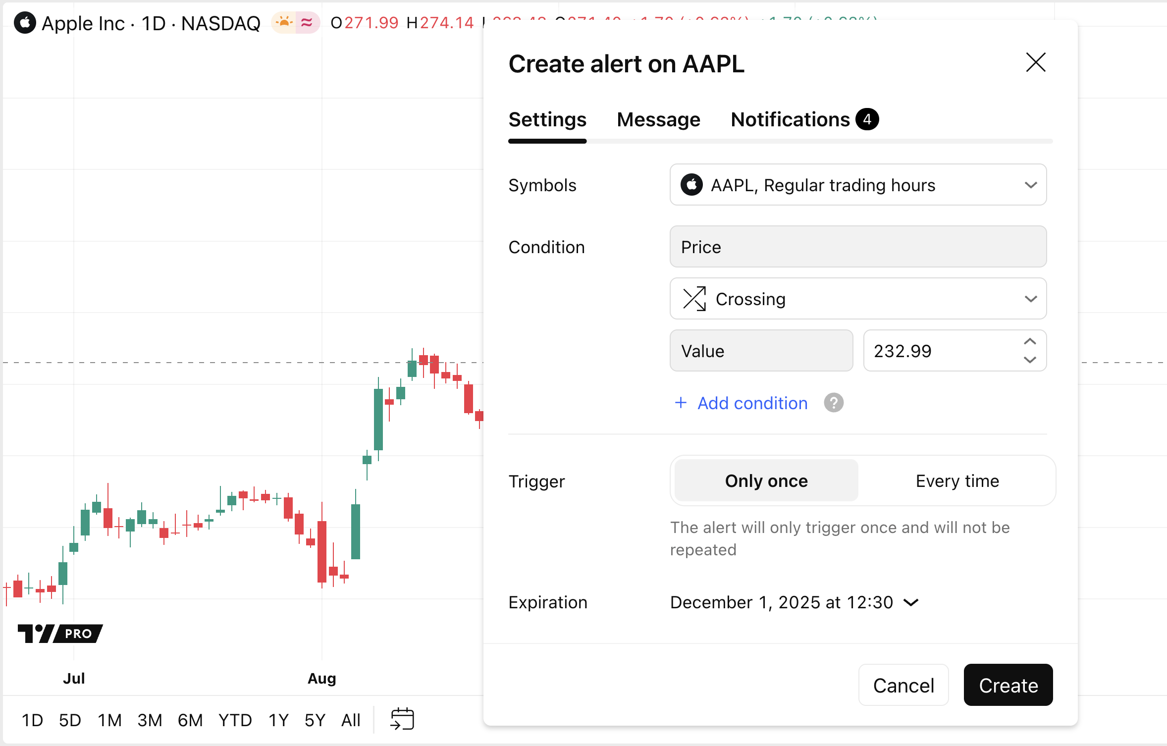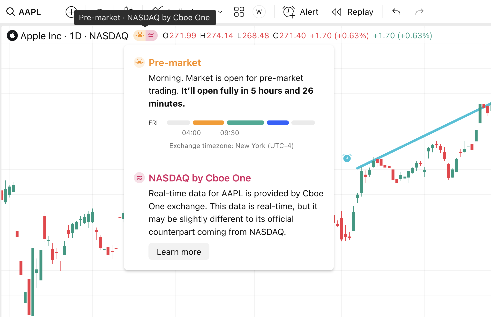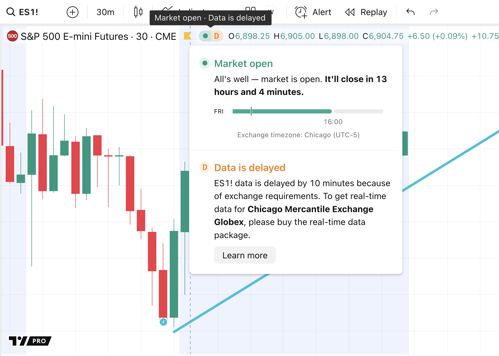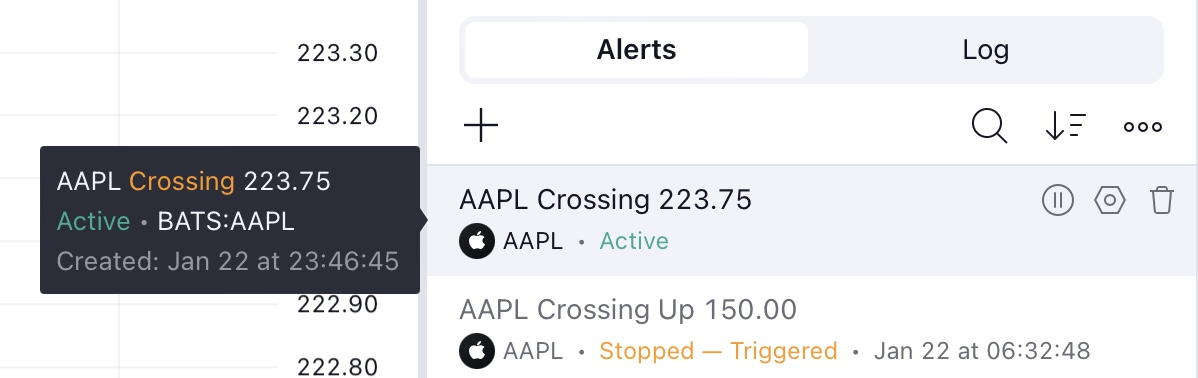 基于实时和非实时商品的警报如果您在图表上看到红色图标,则表示数据由 Cboe 提供。在此处查看更多信息。 对于非 Cboe 提供的任何其它延迟商品,将显示“D”字母。实时数据商品如下所示(没有显示红色图标)。交易所的前缀仅显示在警报管理器部分。请注意,前缀不会显示在警报对话框中。仅指示商品名称。之前之前按类型划分的警报接下来接下来如何在预设时间设置警报?开启超级图表