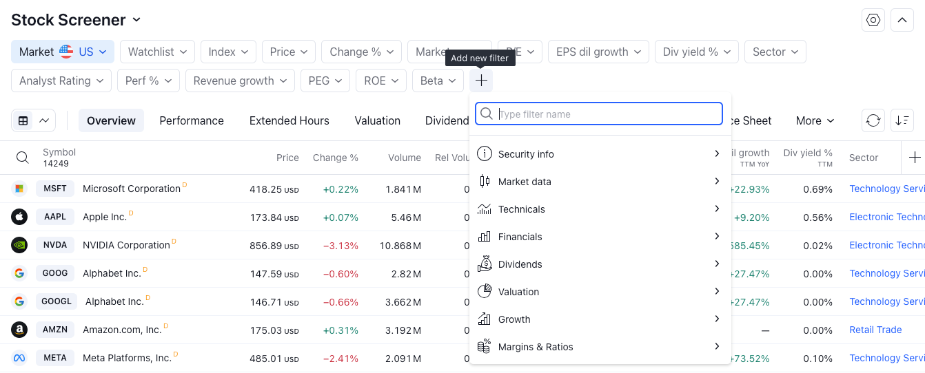 TradingView筛选器提供跨不同资产类别的筛选和分析工具。该平台为初学者和专业人士提供工具,帮助他们识别符合条件的证券。其界面融合了基本功能以及筛选、列管理和数据呈现等特色功能。