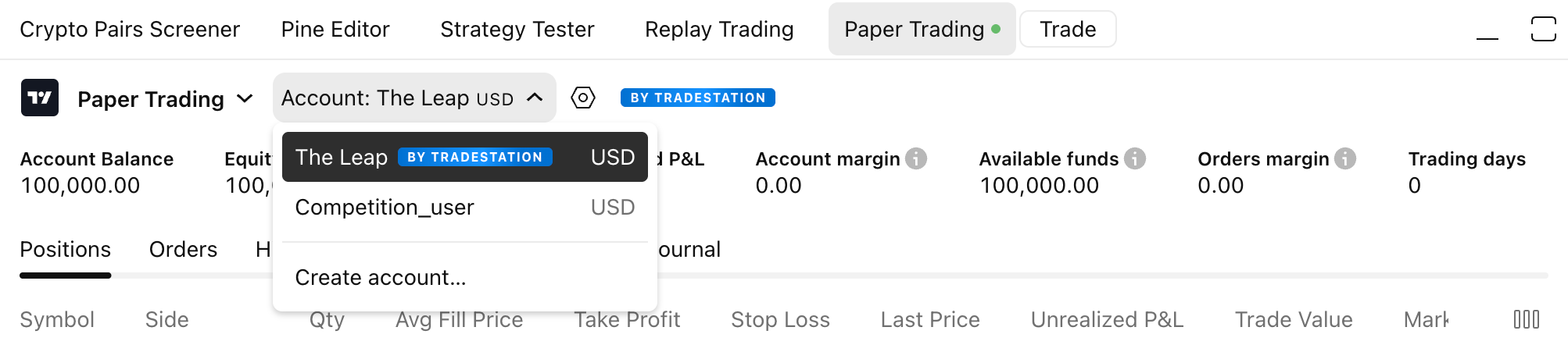 如何选择jing's账户成功报名竞赛后,我们将为您创建一个独立的模拟交易账户。登录模拟交易,从“管理账户”菜单中选择您参加比赛的专属账户。如果您报名参加多个竞赛,每个竞赛都会拥有一个独立的账户。!重要提示:竞赛比赛账户的参数是固定的,无法更改。如果您删除竞赛账户,所有进度都将丢失,并且您将无法重新注报名参加同一竞赛。另请阅读:如何在TradingView交易技术分析要点基本面分析介绍模拟期货,真实市场体验图表交易:主要特点和优势之前之前哪里可以找到The Leap规则接下来接下来如何才能在The Leap赢取奖励开启超级图表