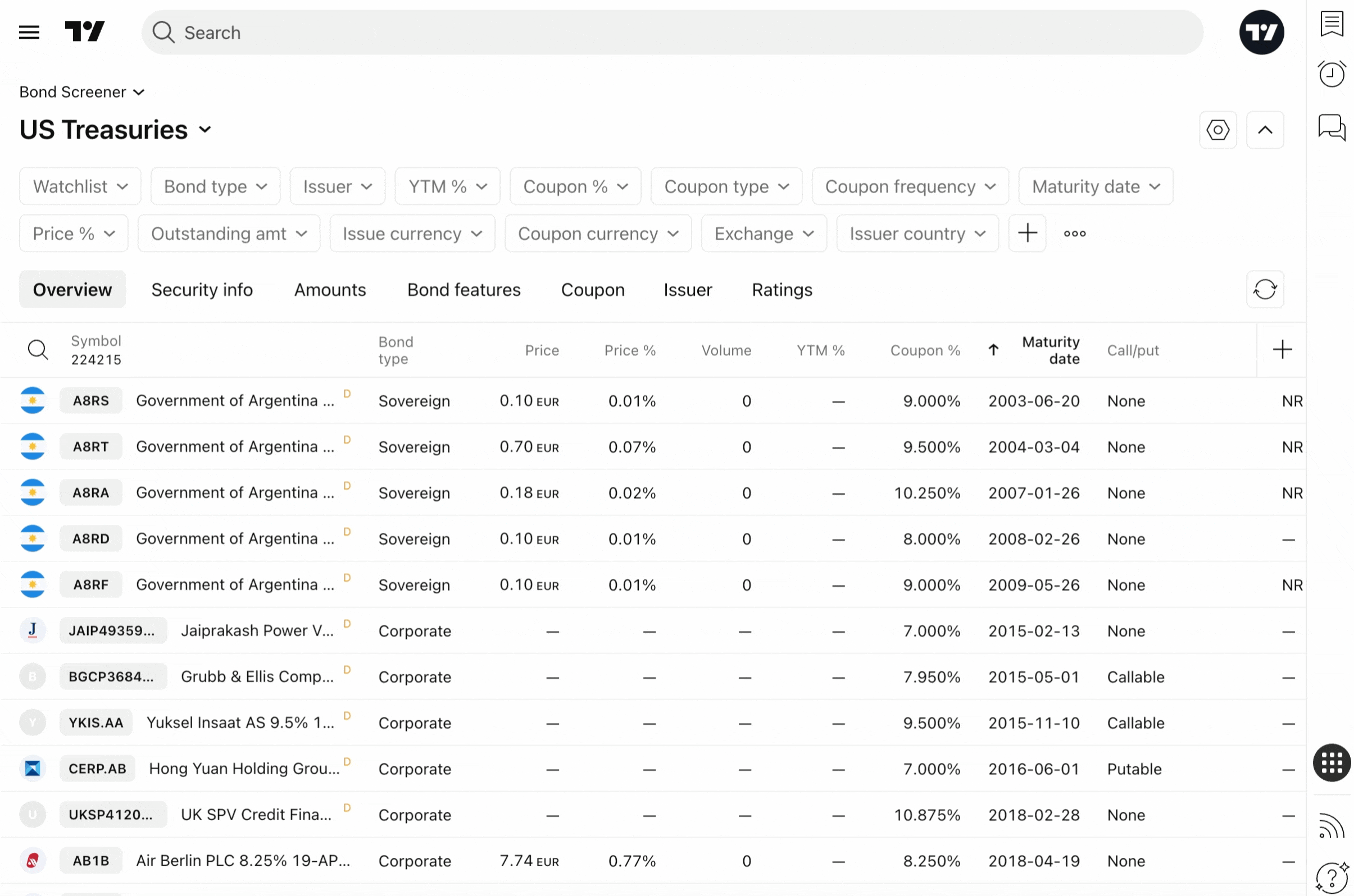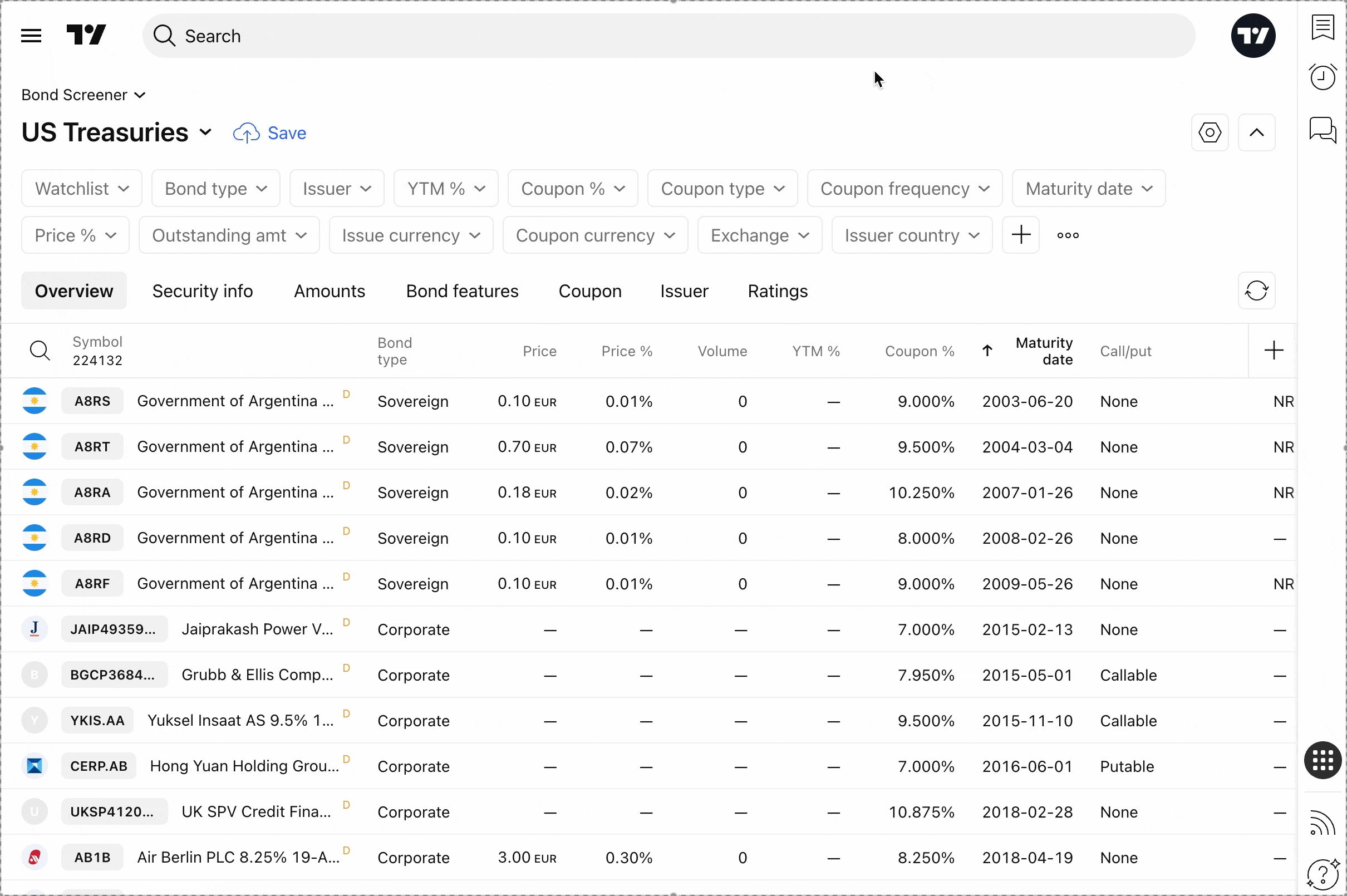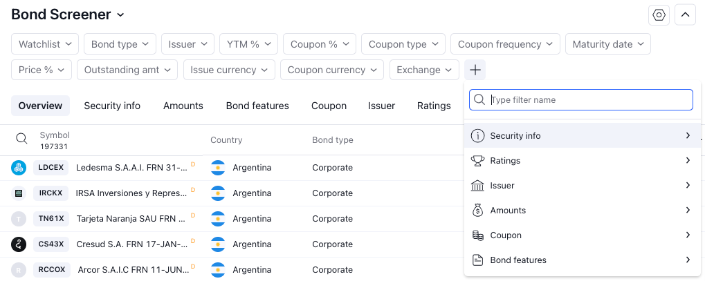 债券筛选器是一款金融分析工具,允许您根据到期日、发行人、票息等各种指标筛选不同的债券。
