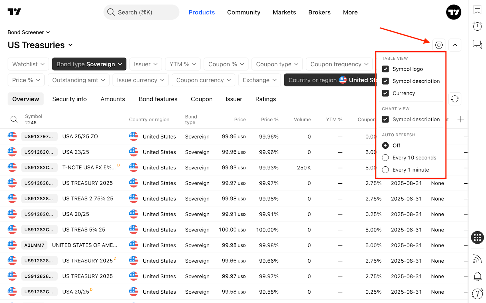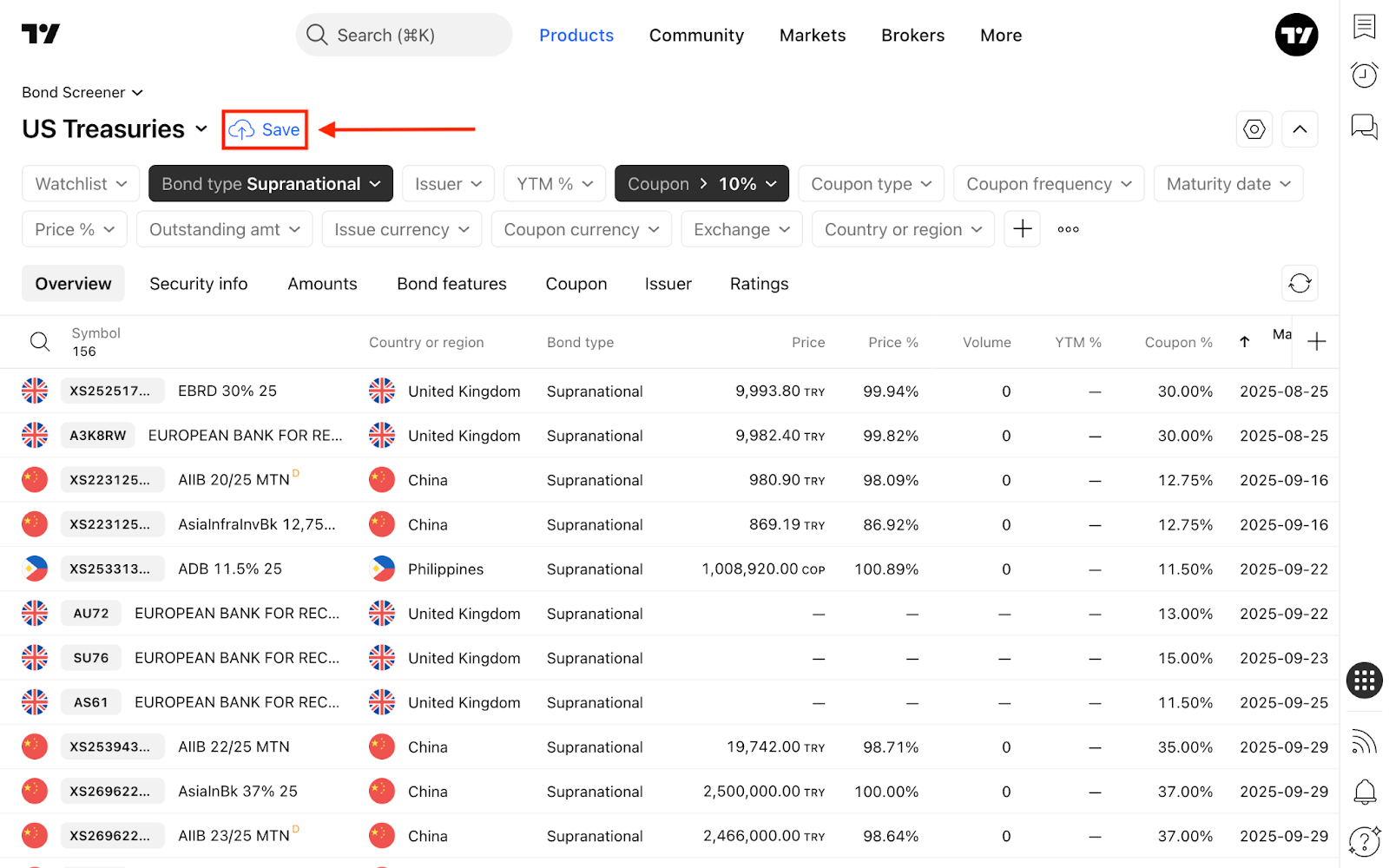 另一种方法是通过超级图表。在右侧工具栏中,点击“产品”→“筛选器”。在顶部,点击“股票筛选器”→“债券筛选器”。