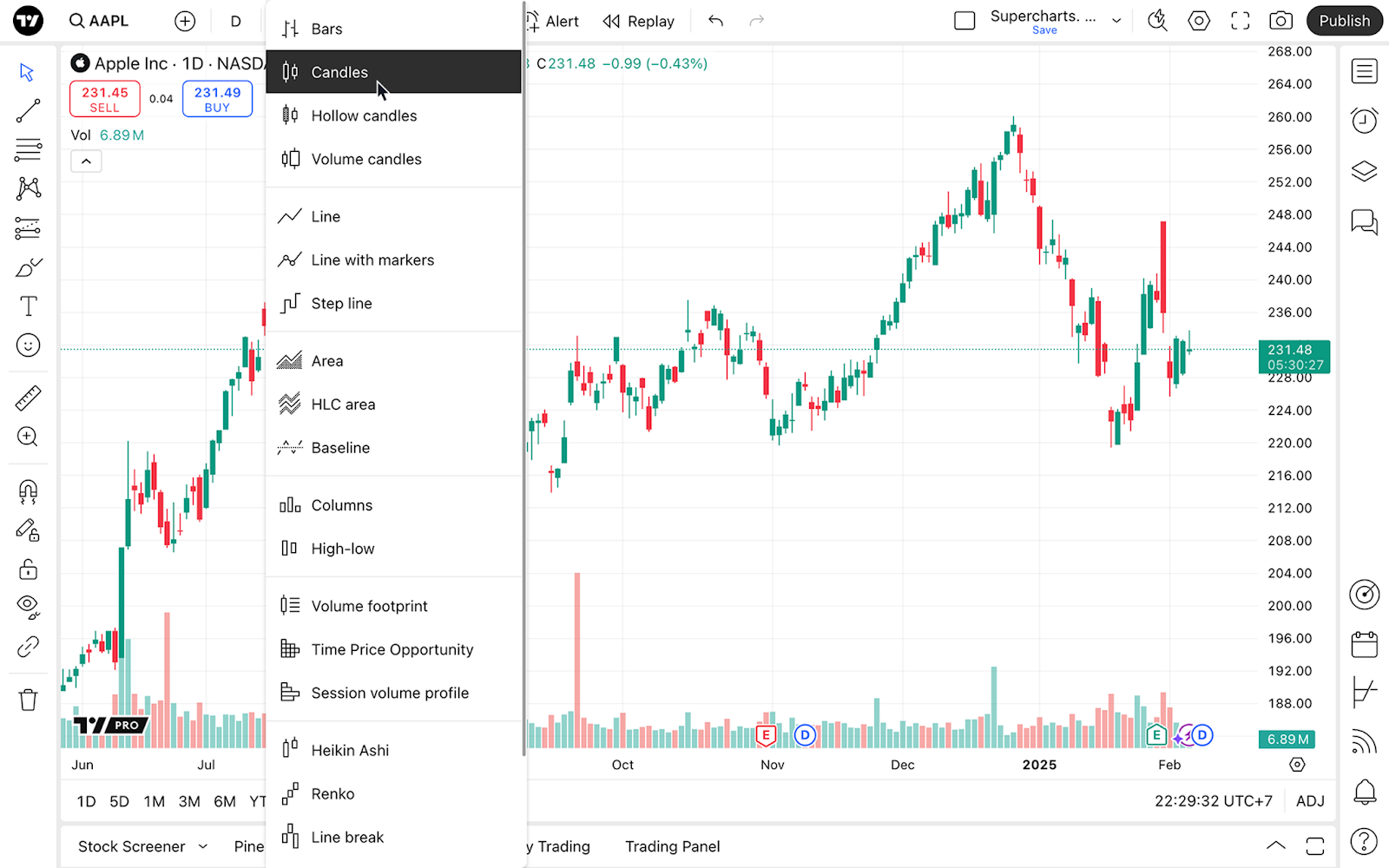 在我们的超级图表中,您可以访问蜡烛图 — 这是最古老的图表方法之一,起源于18世纪的日本,用于分析大米市场的价格走势。蜡烛图形态多样,能够可视化特定时期内的价格动态,帮助您了解市场情绪。
