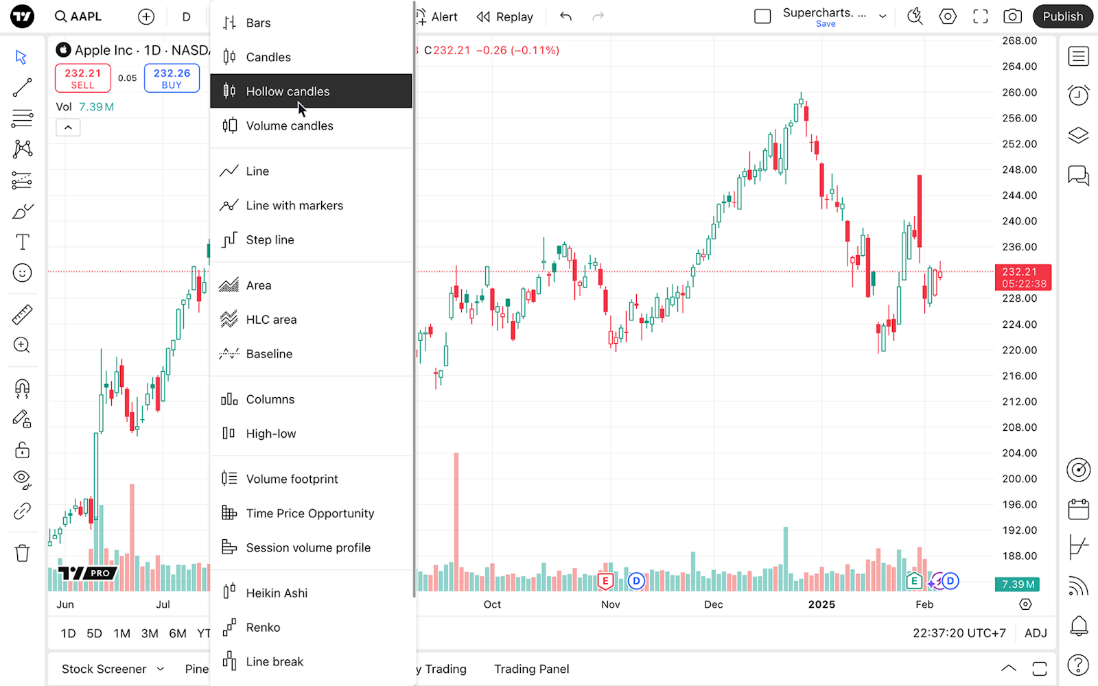 空心K线图是与标准蜡烛图和美国线图一样流行的图表类型。它们与标准的日本蜡烛图非常相似,不同之处在于空心蜡烛图使用颜色和填充来指示价格方向以及开盘价和收盘价之间的关系。借助空心K线图,您可以更轻松地发现趋势反转和市场变化——所有这些都可以在我们的超级图表找到。