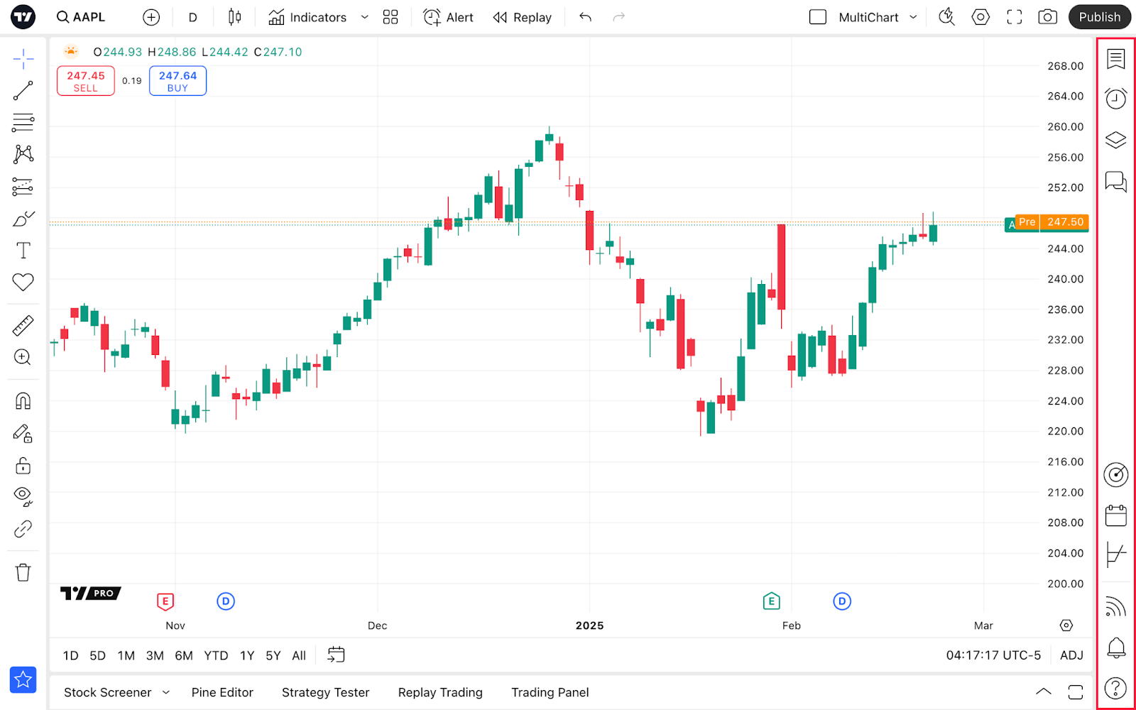 - 筛选器:打开和切换TradingView筛选器以浏览市场而无需离开图表。
