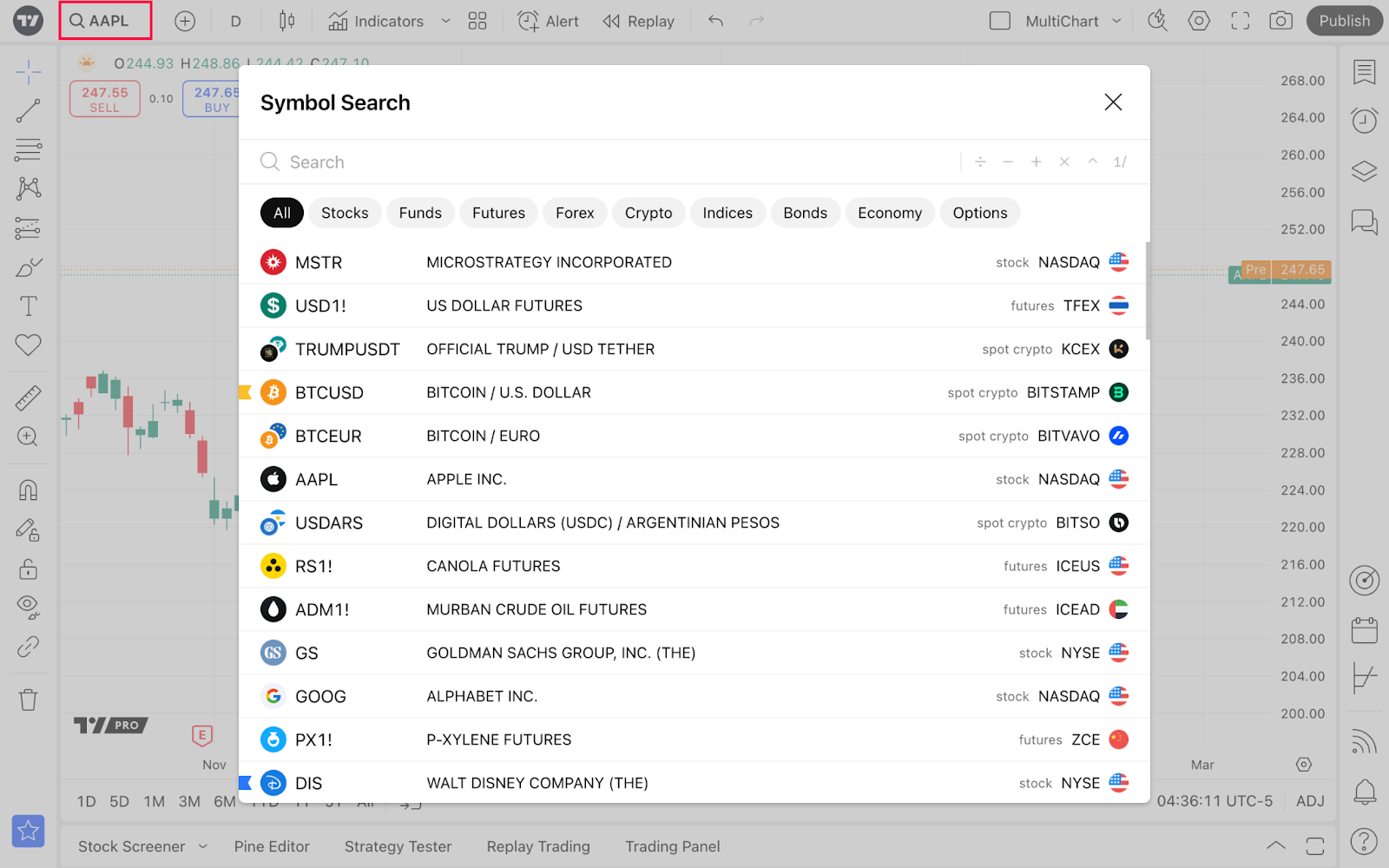 - 开始输入商品代码。例如,要打开苹果公司的股票图表,只需输入“AAPL”。