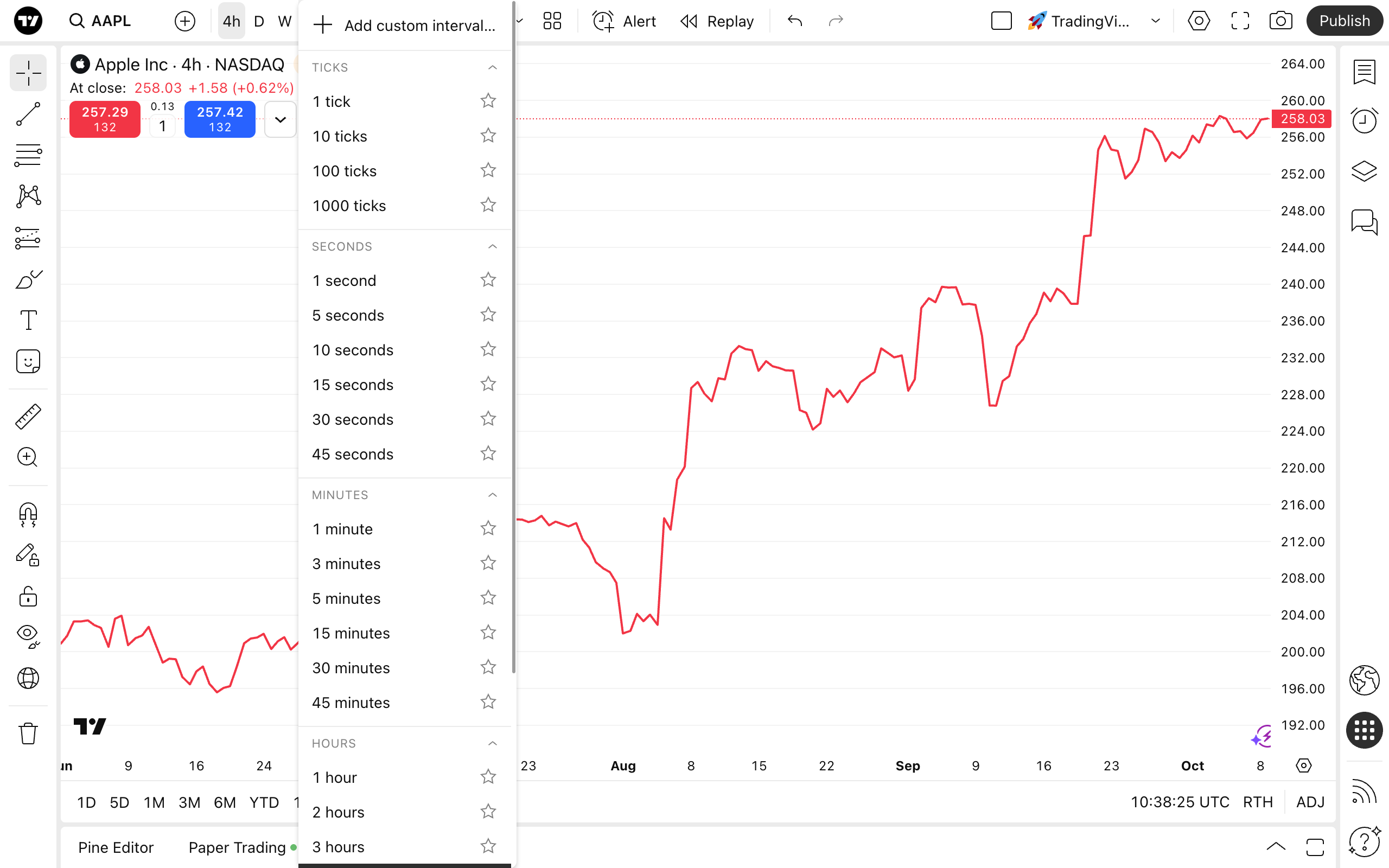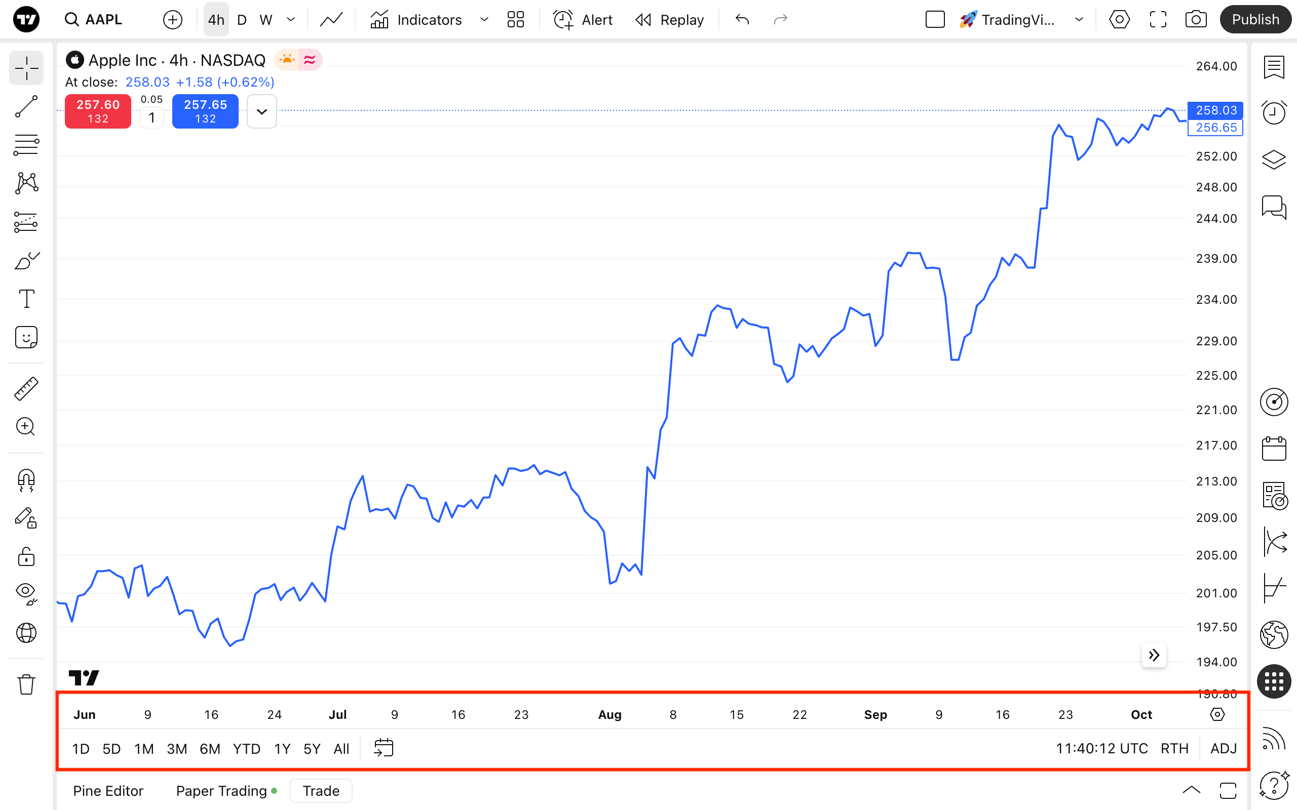在时间坐标下,您可以找到适合您屏幕的预设周期。例如,选择1D会调整图表,以便使用一分钟周期显示一个交易日。按“全部”会以每月周期显示所有可用的历史数据。如果没有任何周期适合您,您可以在“转到”菜单中转到特定日期或创建自定义范围。