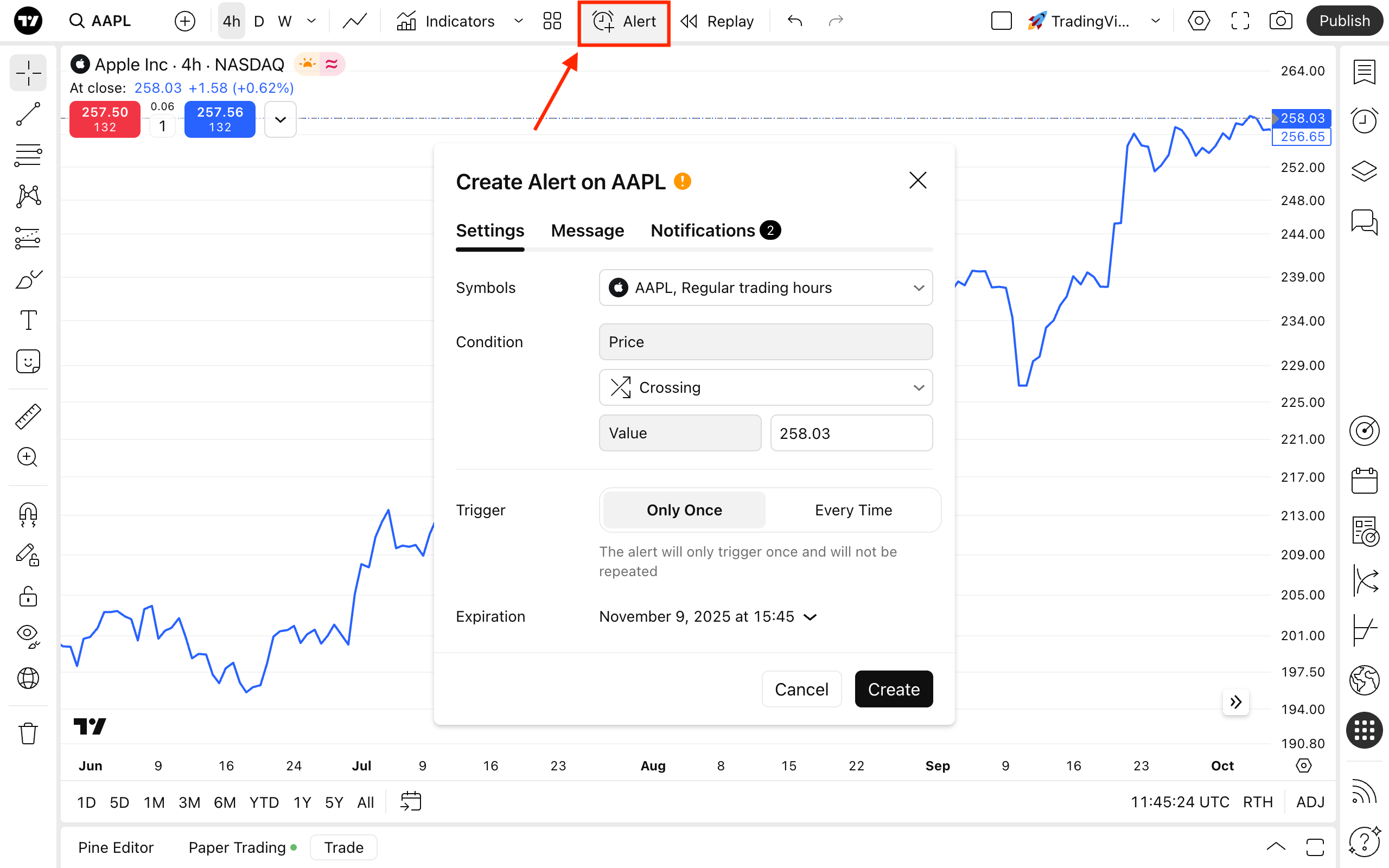 此功能允许您设置警报并管理其通知。借助这些基本工具,您将始终跟踪价格、指标、策略或绘图。您可以选择触发警报的条件、警报的到期日期、在警报旁边留言等等。