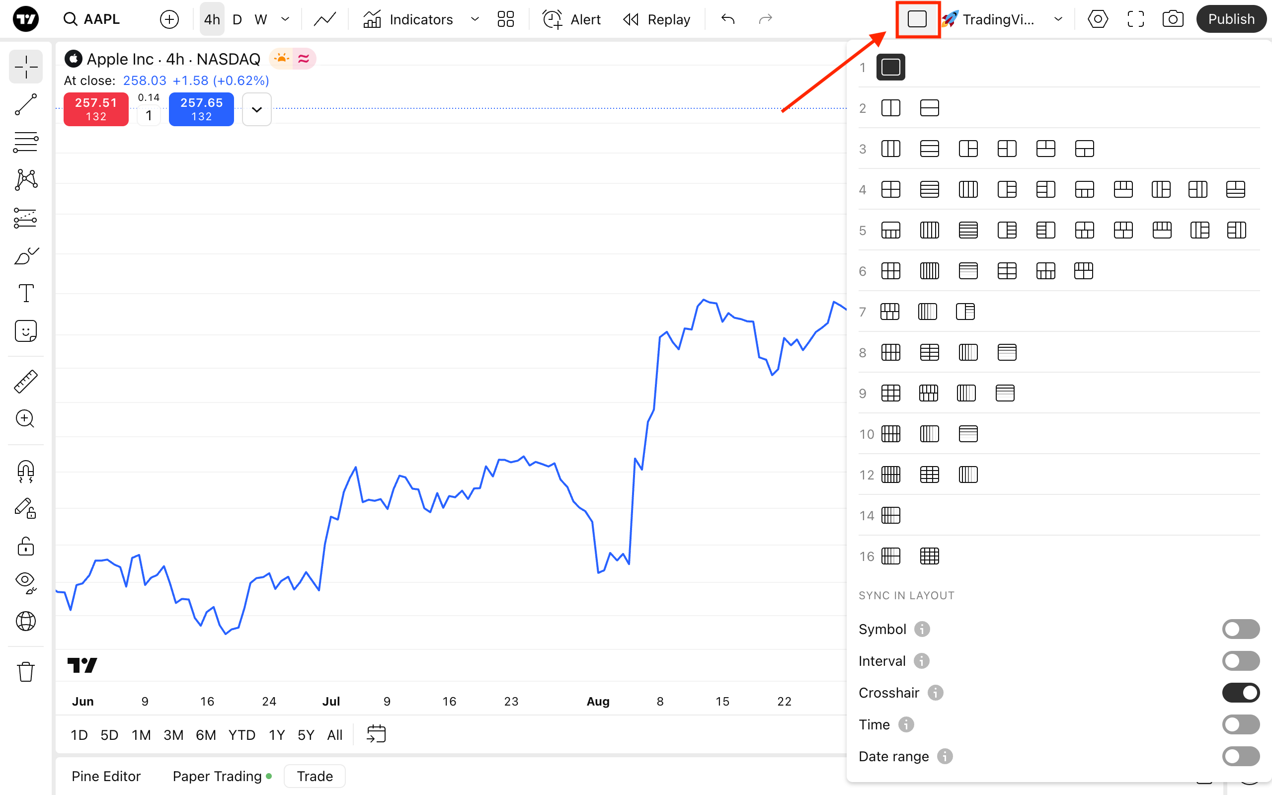在布局设置菜单中,您可以配置图表的数量和位置。从本质上讲,布局是一个单独保存的工作区。布局中的每个图表都保留自己的设置,可以单独自定义,但您也可以选择同步它们。