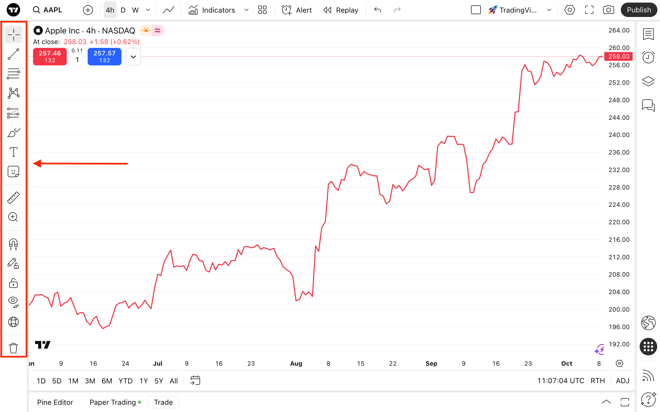如果启用了绘图面板,它将出现在图表的左侧。选择工具来做笔记、添加评论、标记趋势和模式、执行测量和预测以及计算价格水平。
