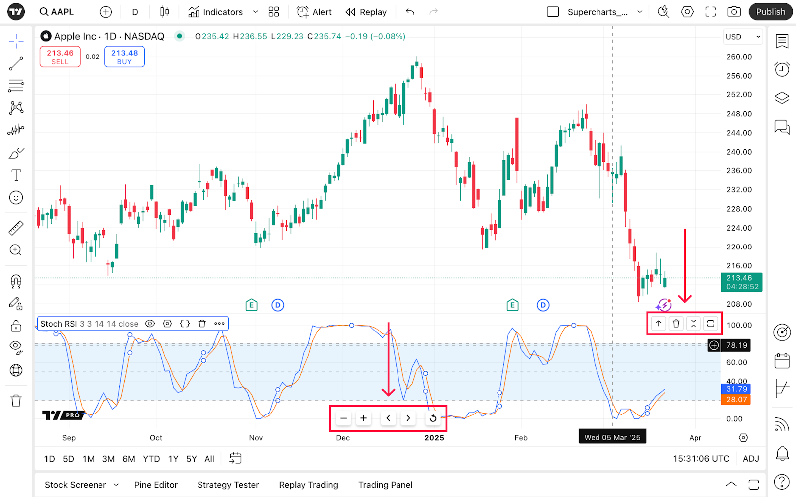 导航按钮位于图表底部。它们可以帮助您放大或缩小图表、向左或向右滚动图表,或重置图表视图。