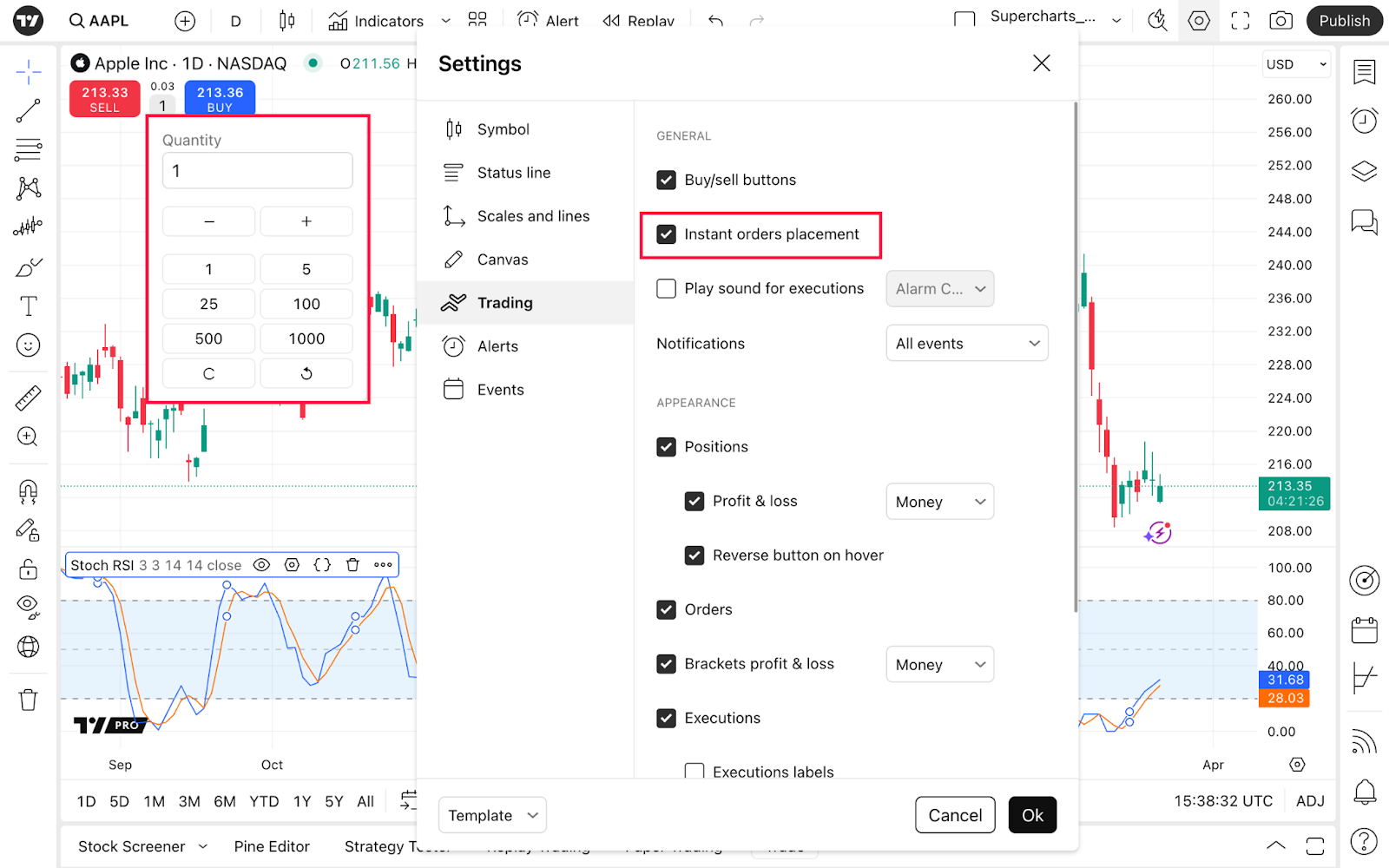 在这里,您可以选择显示买入和卖出按钮,以便您轻松按市价下单。