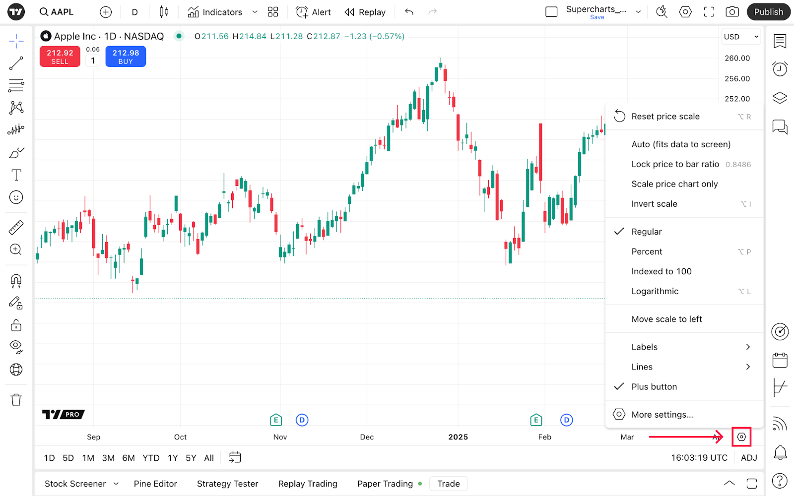 要访问图表设置,请找到上方工具栏或图表底部的齿轮按钮。您也可以双击价格线或价格K线来访问设置窗口。