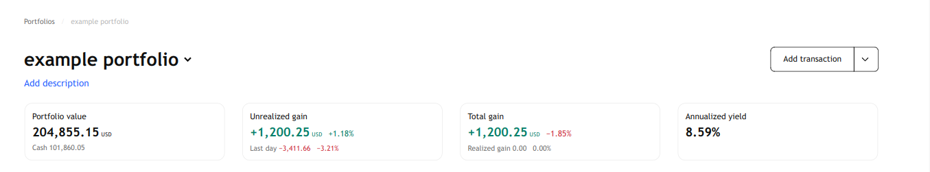 要为某个资产添加交易,请点击投资组合页面右上角的“添加交易”按钮。