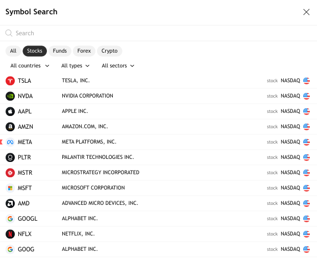 - 商品代码 — 交易工具。打开支持资产的符号搜索。如果您尝试手动输入不支持的交易工具,系统会显示一条通知,提示您不支持此资产类型。